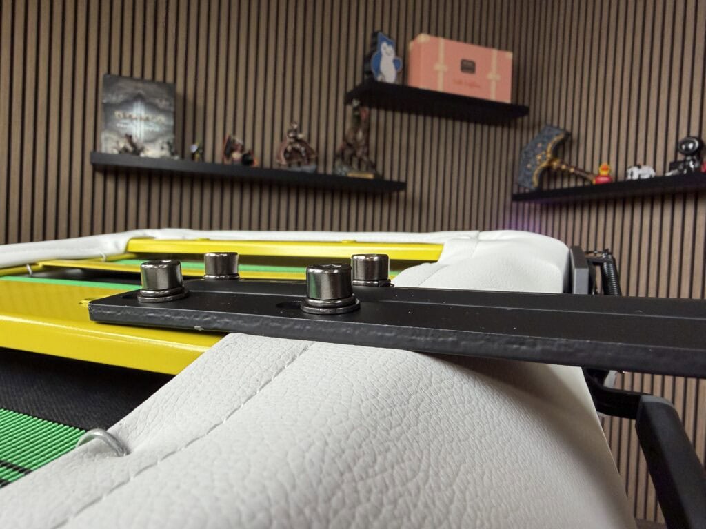 De rugsteun klem je tussen de metalenhouders van het zitvlak. Waarna je deze op zijn plaats houdt met een tweetal schroeven. Tijdens montage moesten we even zoeken en goed uitlijnen, iets wat niet direct in één keer soepel ging. We hebben de schroeven om-en-om vastgedraaid, zodat de rugsteun netjes op zijn plaats blijft. Overigens levert Hator ook kunststofkappen mee met magneten. Deze schermen de metalenhouders netjes af. Daarmee krijgt het geheel een strak uiterlijk.