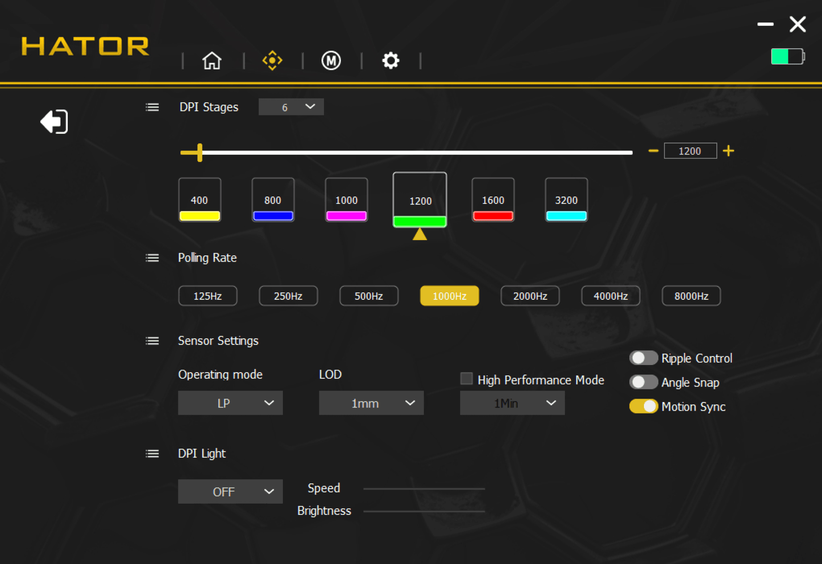 Het eerste tabblad uit de software bestaat uit keymapping voor de knoppen. Het tweede tabblad bestaat uit het finetunen van de sensorinstellingen, waaronder diverse DPI-niveaus en uiteraard het instellen van de pollingsnelheid tot maximaal 8000 Hz. Een mooie toevoeging is de instelbare LOD (Lift Off Distance); instelbaar in stappen van 0,7, 1 en 2 mm.