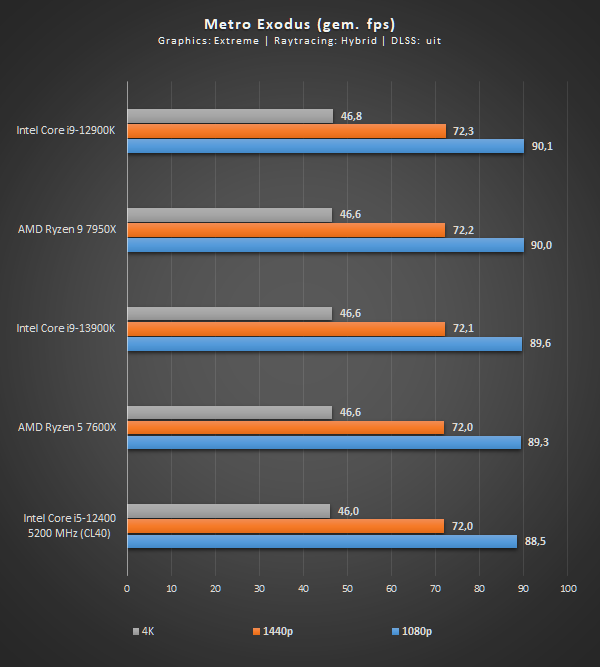 Als we praten over gebondenheid aan de videokaart, dan kan Metro Exodus op Extreme niet uitblijven. Ik had het niet verwacht, maar de 13900K weet hier 0,1 tot 0,2 fps gemiddeld meer te bieden. Dat oogt lachwekkend klein, maar gezien we deze test tot wel vijf keer herhalen en daar het gemiddelde van nemen, zijn miniscule sprongen toch echt wel zichtbaar. Technisch gezien is Intel hier de snelste op elke resolutie.