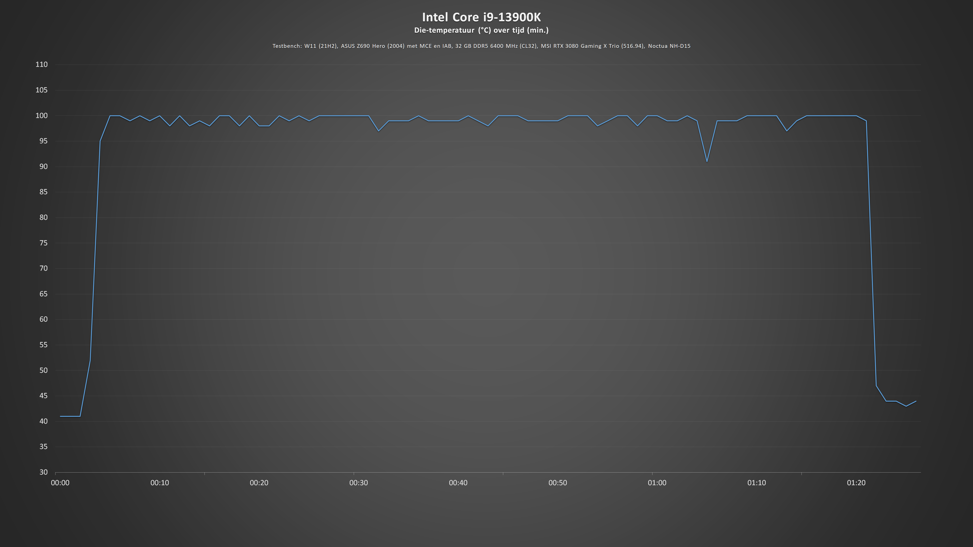 Belangrijk om hier aan te kaarten, is dat de Intel Core i9-13900K én AMD Ryzen 9 7950X niet hun volledige potentie hebben benut. In Blender én Cinebench R23 deed de 13900K namelijk thermal throttling ervaren, ofwel tegen het processorlimiet van 100 °C aanstoten. Dat vanwege het testen met enhancements in het moederbord aan, waar onze Noctua NH-D15 voorheen bij de 12900K geen problemen mee had.