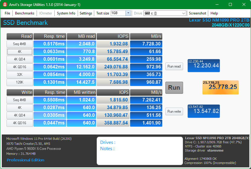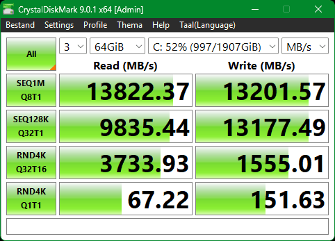 De Lexar NM1090 Pro presteert goed. Waar de schrijfsnelheden vermeld worden met een max van 13.000 MB/s, valt bij CrystalDiskMark te zien dat hij er zelfs boven presteert. Met 13.200 MB/s aan schrijven zit dit dus ruim boven de specificaties, hierdoor is dit natuurlijk altijd fijn meegenomen. Ook in dagelijks gebruik merk ik consistente snelheden die mij soms nog doen verbazen.