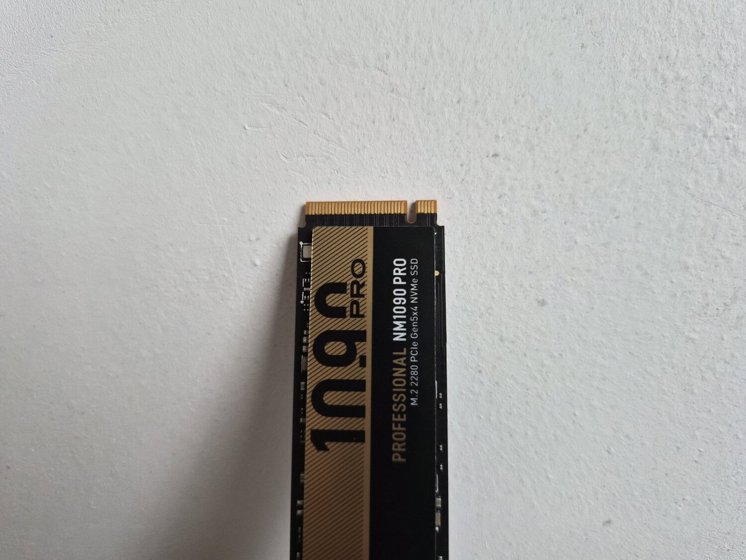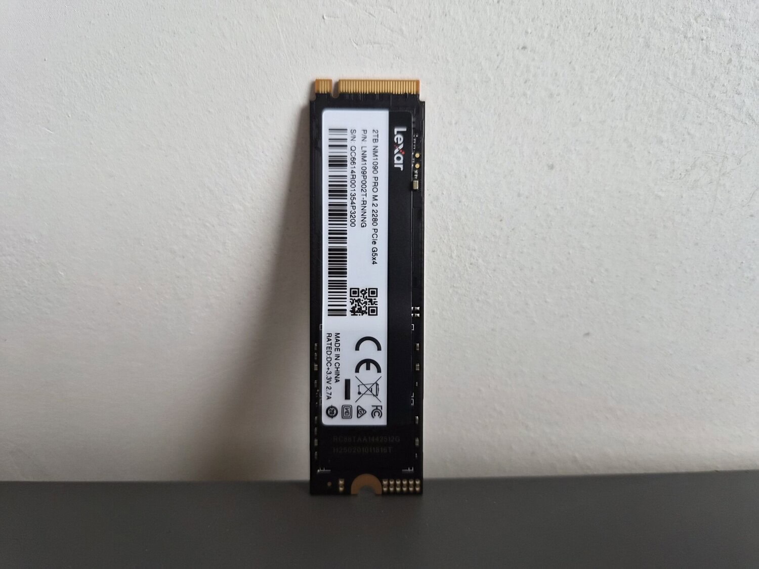 Maar we zijn nog niet klaar. Hier zien we de Lexar NM1090 Pro in zijn volle glorie, staand tegen een muur. Bovenop de SSD zit een sticker, die gemaakt is van koper/grafeen, waardoor het helpt met het wegwerken van de hitte van de SSD. Toch raad ik te allen tijde aan om hier een heatsink overheen te plaatsen.
