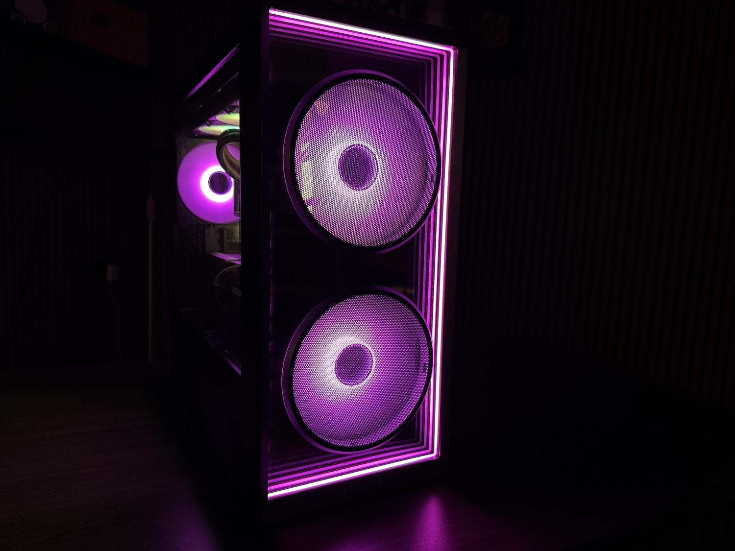 Wat mij persoonlijk het meest nieuwsgierig maakte, was de spiegelende voorkant. Vooraf wist ik namelijk niet zo goed wat ik ervan moest verwachten, maar in de praktijk blijkt dit juist één van de meest opvallende gedeelten van de kast te zijn. Het tempered-glass frontpaneel met infinity mirror-effect zorgt voor een dynamisch aanzicht dat afhankelijk van de kijkhoek en RGB-verlichting steeds anders oogt. We waren hier dan ook echt van onder de indruk; het is bijna een magisch effect.