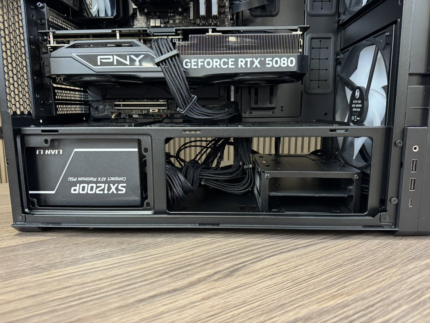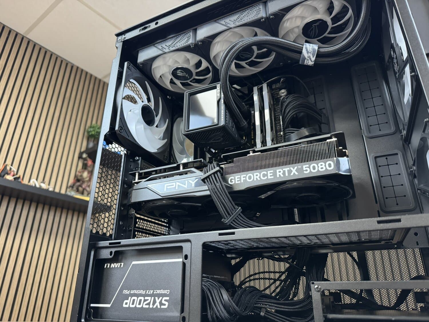 Kabelmanagement is ook goed geregeld: zo is de GPU-stroomkabel slim via de zijkant van het moederbord weg te werken, waardoor de binnenkant er op camera ook gewoon strak uitziet. De front-panelkabels vragen daarentegen iets meer aandacht; deze moet je loshalen om ze goed op het moederbord aangesloten te krijgen. Niet moeilijk, maar wel zo’n moment waarop je hoopt dat niemand meekijkt… behalve een paar honderd kijkers - en Esther.