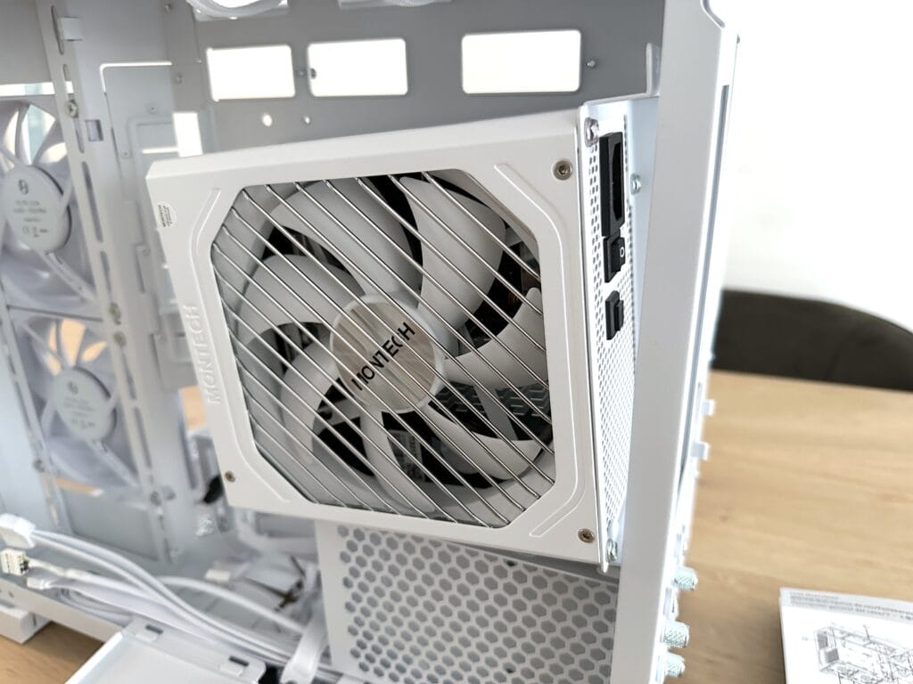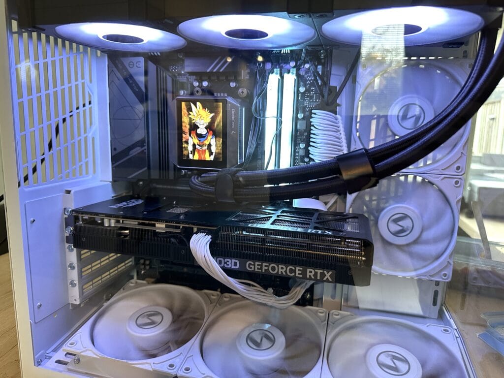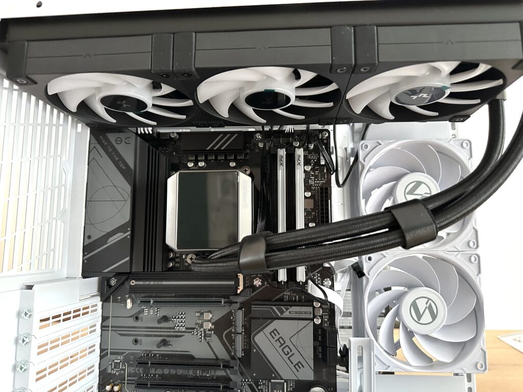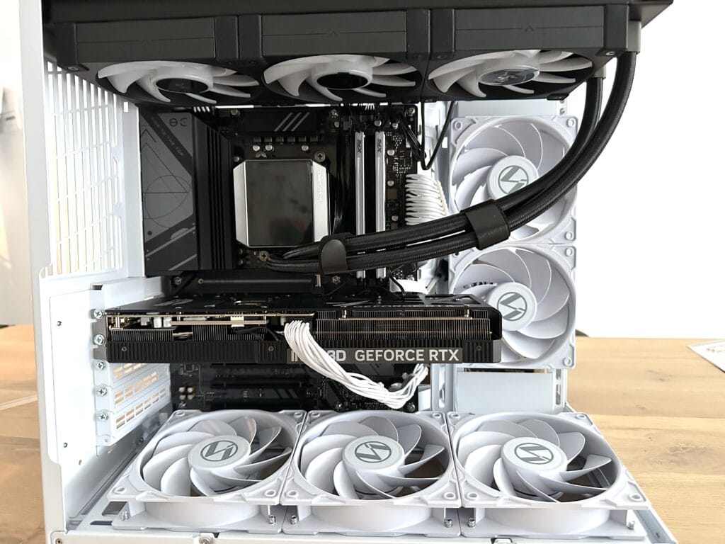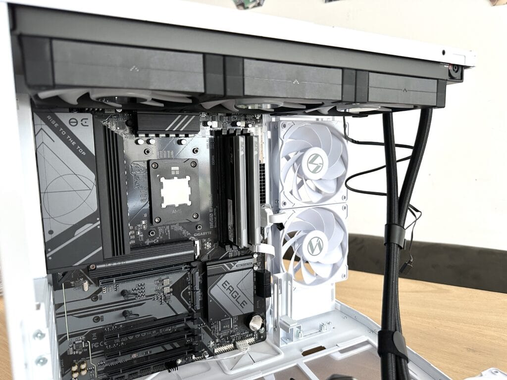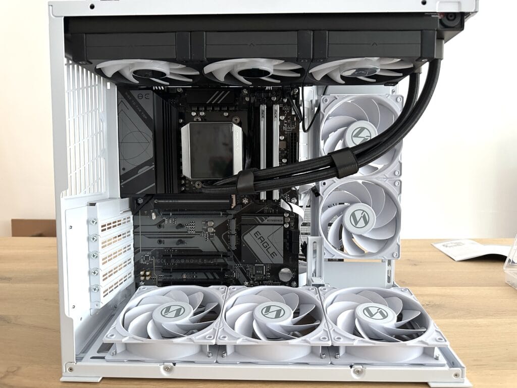 Dankzij de volledig open bovenkant konden we ook de 360 mm-radiator van de waterkoeling direct monteren, zonder dat we onderdelen hoefden te verplaatsen of te meten. De ruime lay-out en slimme indeling maken het gemakkelijk om overal bij te kunnen, wat het bouwproces snel, overzichtelijk en vooral aangenaam maakt.
