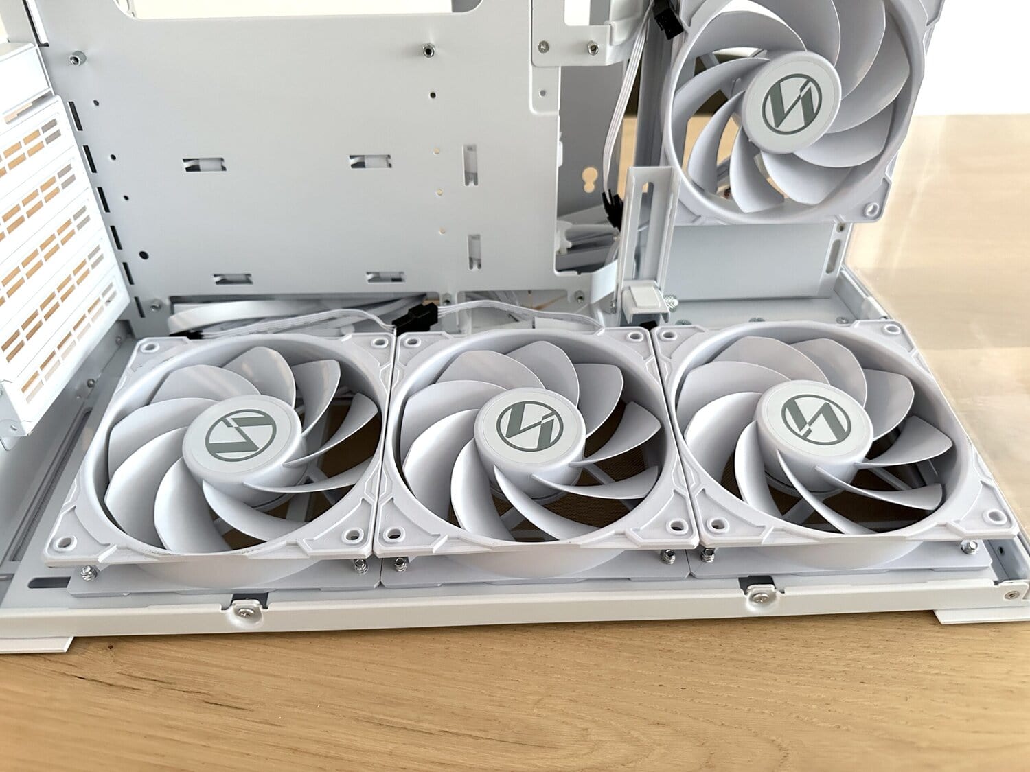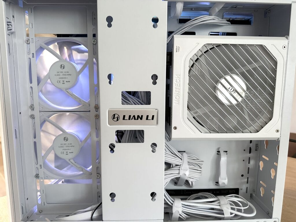De casefans in de O11D Mini V2 Flow zijn echt strak en netjes gemonteerd, precies zoals je van Lian Li zou verwachten. Wat vooral opvalt, zijn de ventilatoren aan de onderkant: die zijn niet recht, maar een beetje schuin geplaatst. Deze slimme positionering zorgt ervoor dat de luchtstroom beter gericht is op de videokaart, wat de koeling van de GPU ten goede komt - vooral handig voor krachtige kaarten die snel warm kunnen worden.