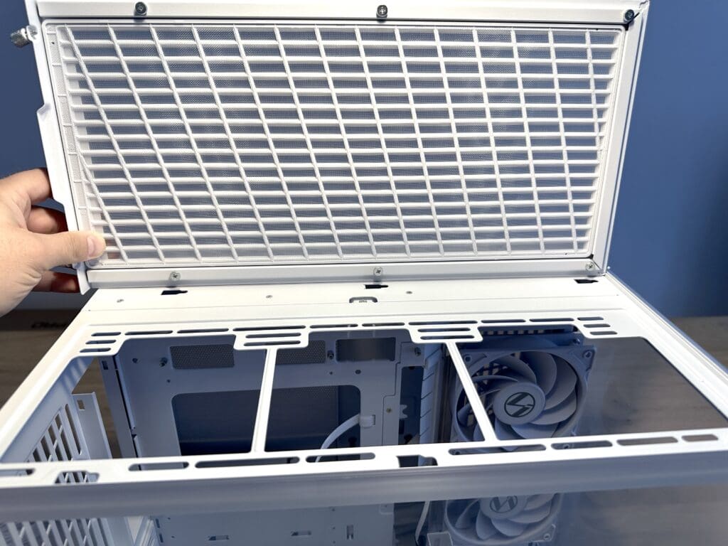 Dit geeft je meteen extra werkruimte aan de bovenkant van de behuizing, wat het installeren van componenten zoals een radiator, extra ventilatoren, kabels of in ons geval een 360mm AiO-waterkoeler een stuk eenvoudiger maakt.