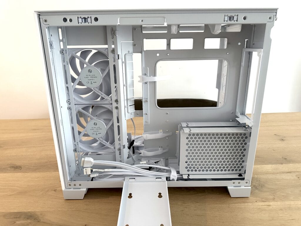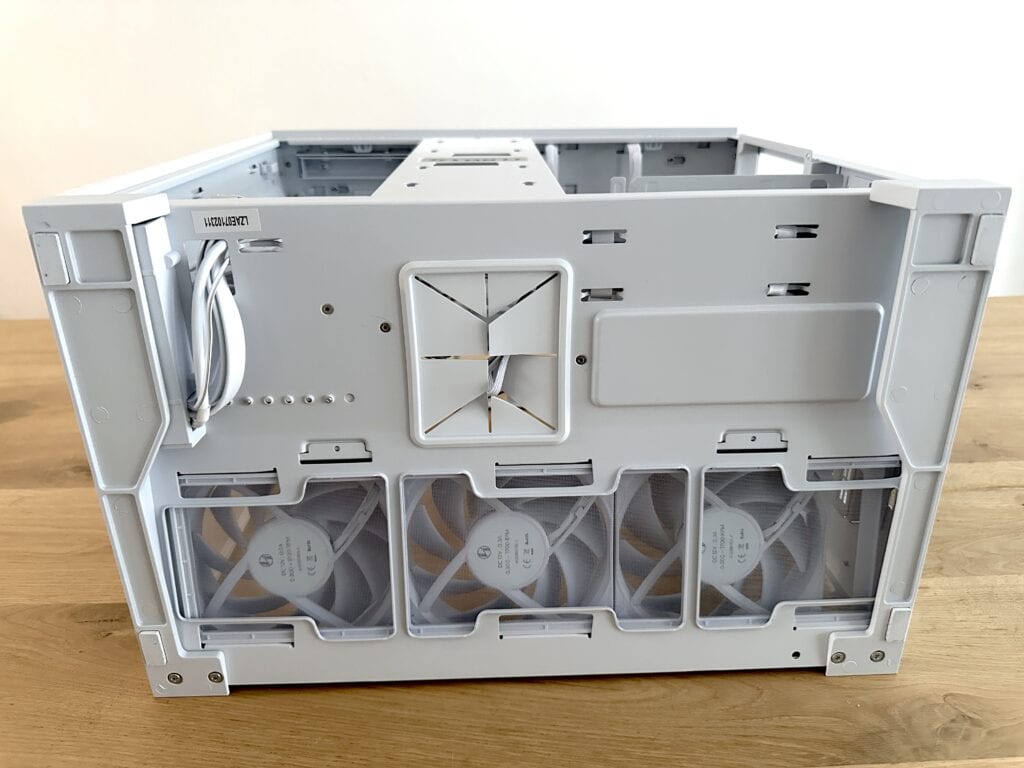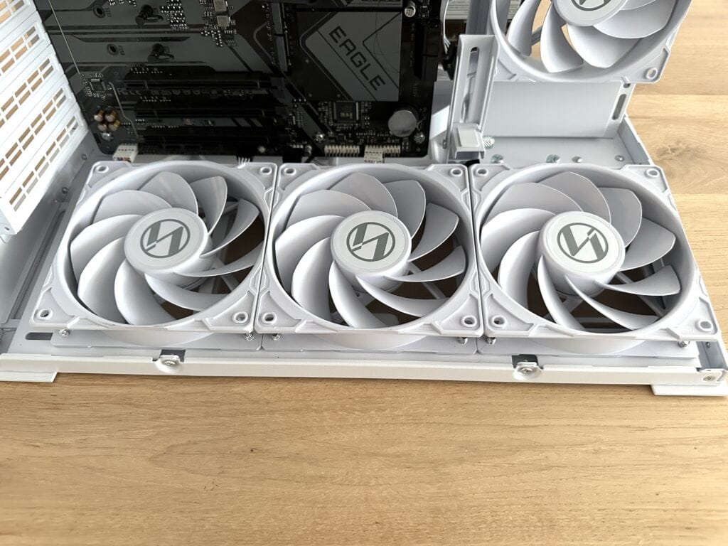 De volgende stap in de bouw is het verwijderen van de drie casefans aan de onderzijde van de O11D Mini V2 Flow. Dit is nodig om goed bij de onderkant van het moederbord te kunnen tijdens de installatie en het aansluiten van kabels. Gelukkig heeft Lian Li dit slim opgelost: de drie ventilatoren zitten namelijk op één losse montageplaat bevestigd. Hierdoor kun je de volledige plaat in één keer loshalen, waardoor het verwijderen van de fans snel en eenvoudig gaat en je direct alle ruimte hebt om comfortabel te werken.