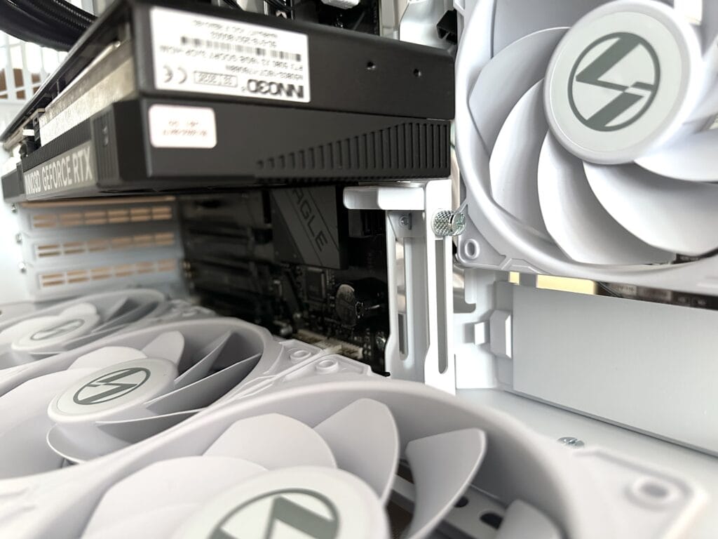 De volgende stap is het installeren van de videokaart, in dit geval een krachtige RTX 5080. Bij zulke grote en zware GPU’s is stabiliteit cruciaal, en het is geweldig dat de O11D Mini V2 Flow is uitgerust met een ingebouwde, verstelbare GPU-bracket die je eenvoudig op de juiste hoogte kunt afstellen.