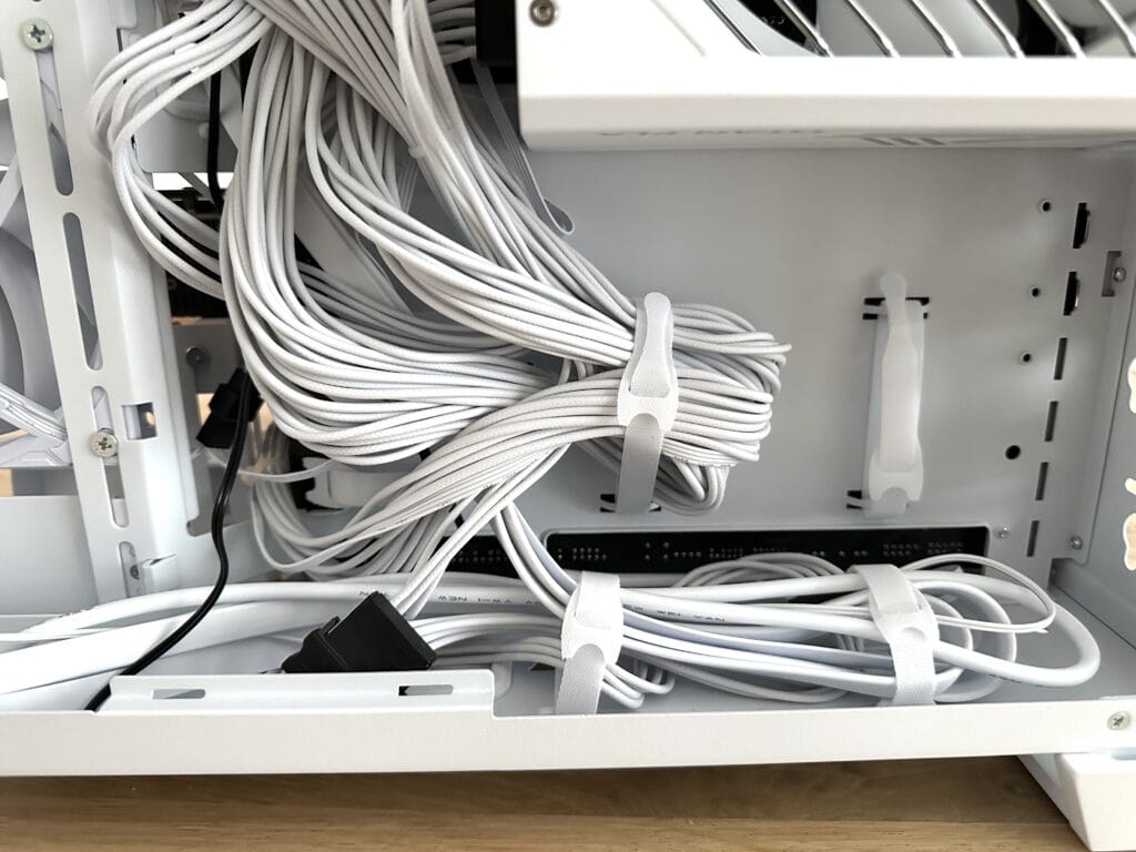 Gelukkig maakt de O11D Mini V2 Flow het heel eenvoudig om de kabels netjes weg te werken. Zoals eerder genoemd, zitten er overal klittenbandstrips, ook aan de boven- en onderkant, waardoor je de kabels gemakkelijk kunt bundelen en vastzetten. Zo blijft alles goed op zijn plek en ligt er niets rommelig verspreid.