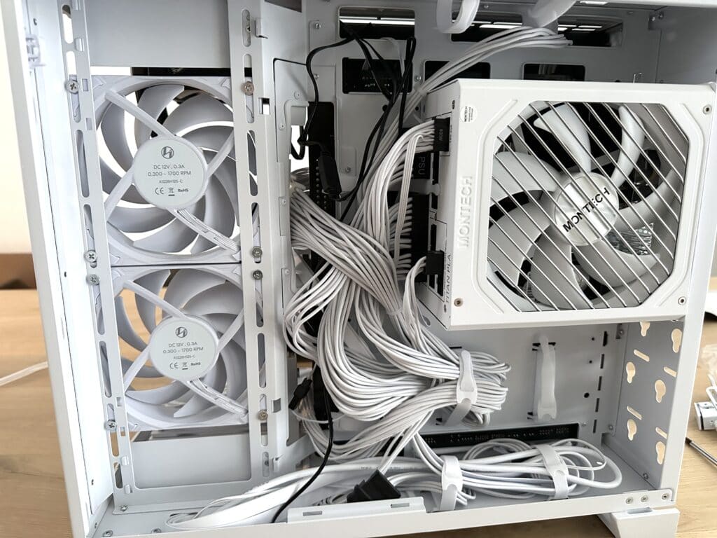 Toch had het nog netter gekund: de fans maken gebruik van losse kabels, en hoewel deze netjes doorkoppelbaar zijn, zien ze er iets minder strak uit dan de volledig klikbare fanmodules die we bij sommige moderne cases tegenkomen. Hierdoor blijft het een kleine uitdaging om het kabelmanagement echt perfect weg te werken - al is het eindresultaat nog steeds netjes en verzorgd.