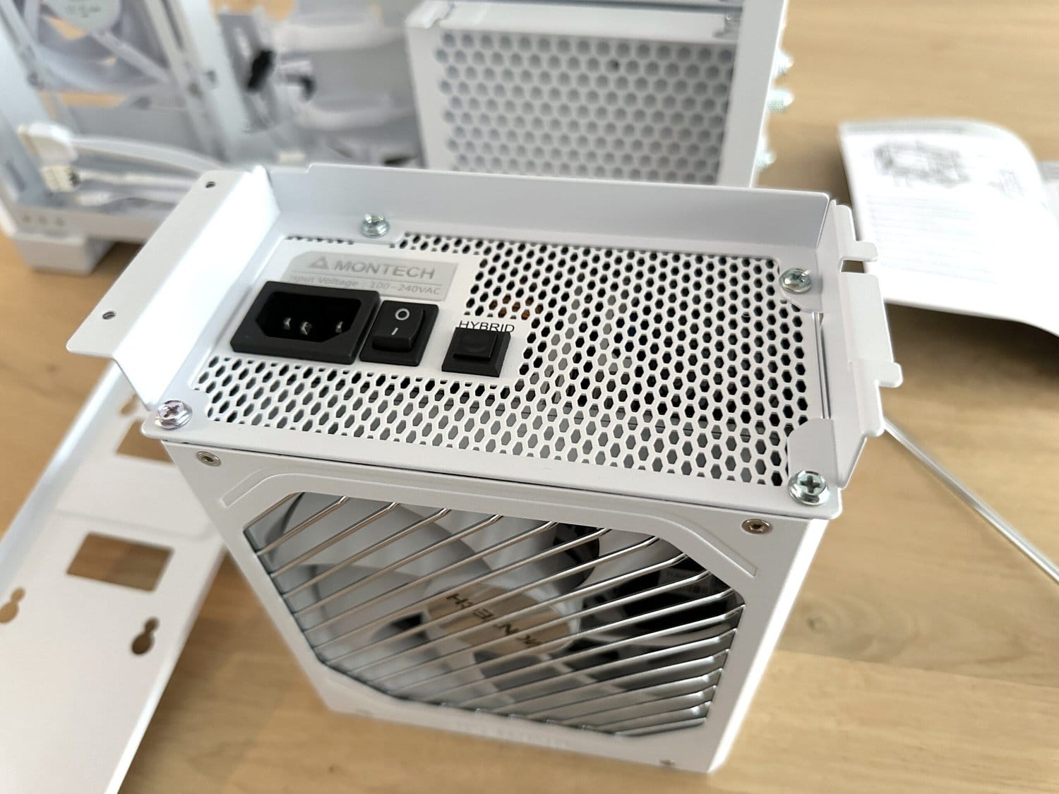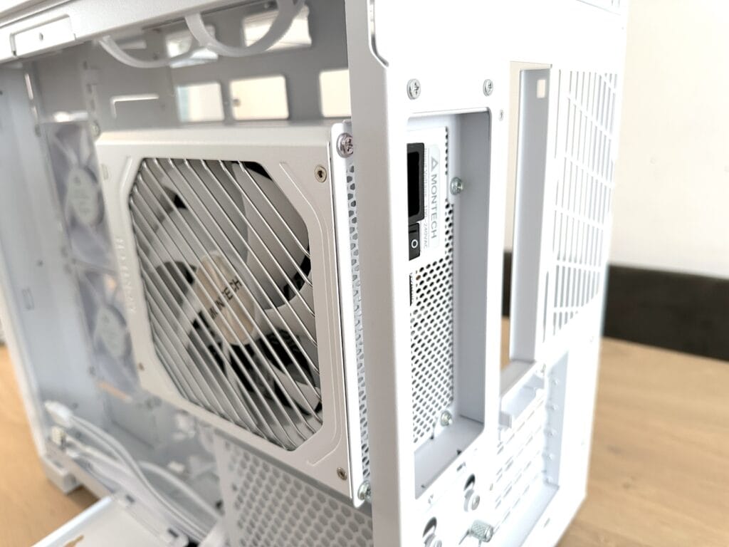 Het installeren van de voeding in de O11D Mini V2 Flow is verrassend eenvoudig en goed doordacht. In plaats van de voeding direct in de behuizing te monteren, bevestig je deze eerst aan een speciale bracket. Dit zorgt ervoor dat hij stevig op zijn plek blijft tijdens het inbouwen. Daarna schuif je de bracket met de voeding moeiteloos in de behuizing en zet je hem vast.
