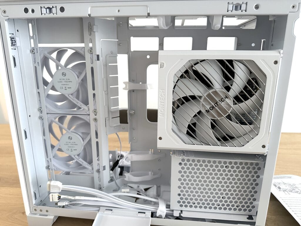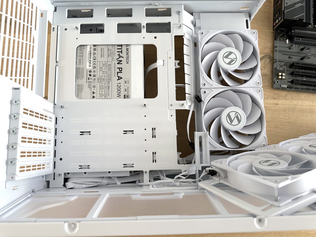 Zodra alle verbindingen stevig en netjes waren bevestigd, hebben we de drie casefans aan de onderkant weer op hun montageplaat geplaatst en vastgeschroefd. Hiermee was de onderzijde van de behuizing weer compleet, en konden we beginnen met het aansluiten van de voeding om alle componenten van stroom te voorzien.