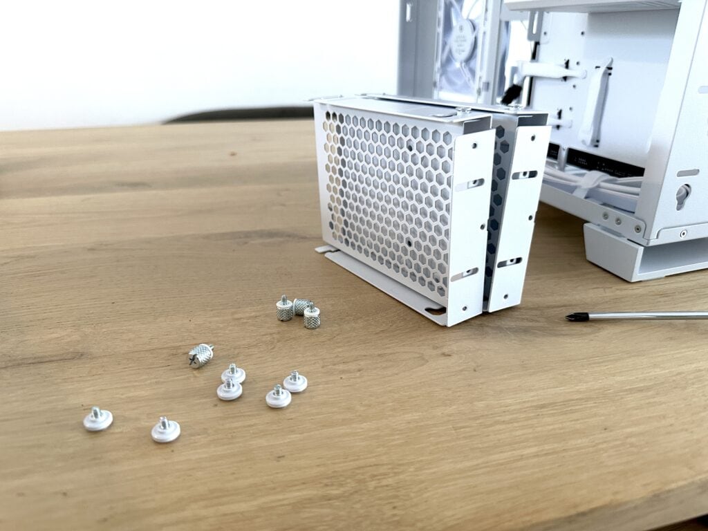 Daarnaast hebben we ervoor gekozen om beide hardeschijfkooien te verwijderen. Hoewel het praktisch is dat Lian Li deze standaard meelevert, levert het weghalen ervan extra ruimte voor kabelmanagement op en oogt de binnenkant meteen een stuk strakker. Zo creëren we een net en overzichtelijk fundament voor de verdere opbouw van het systeem.