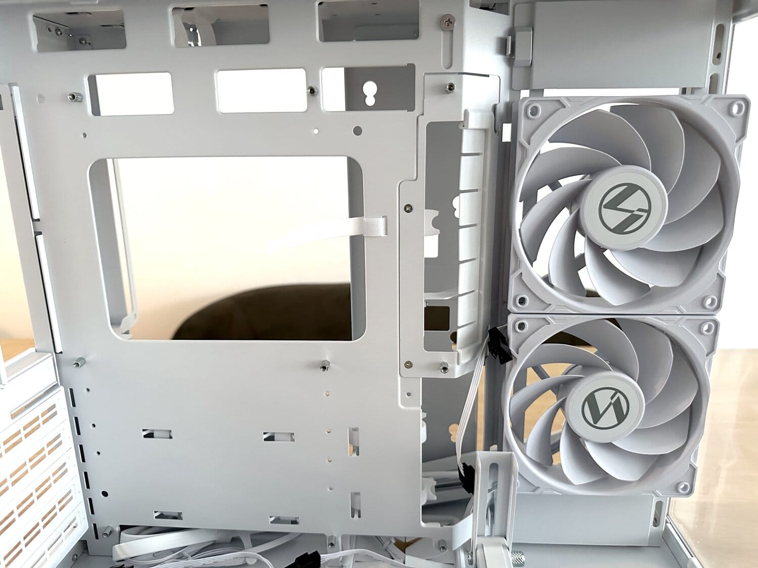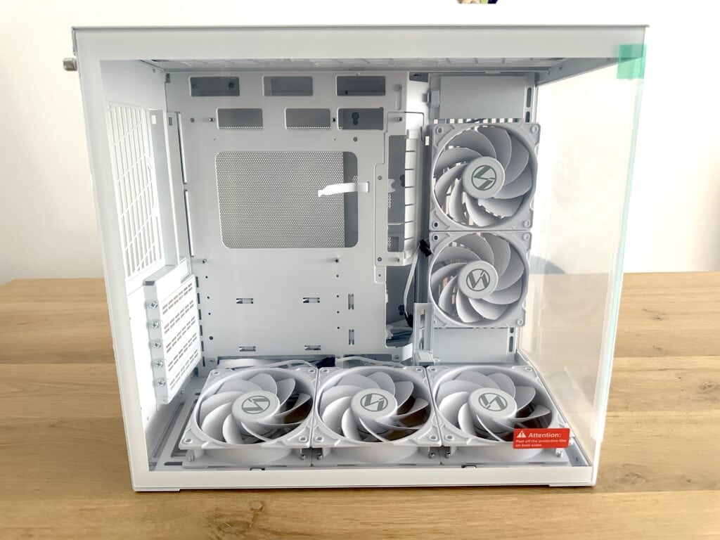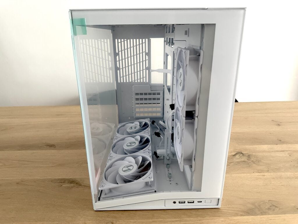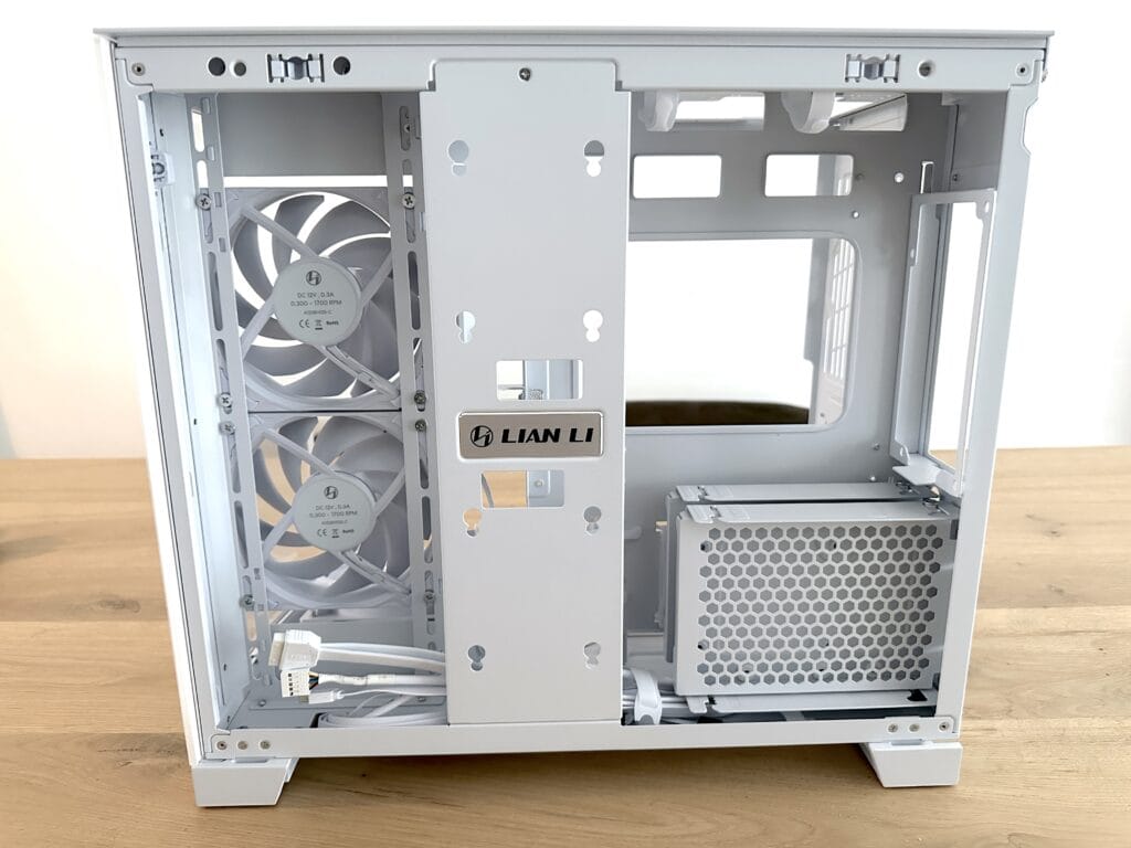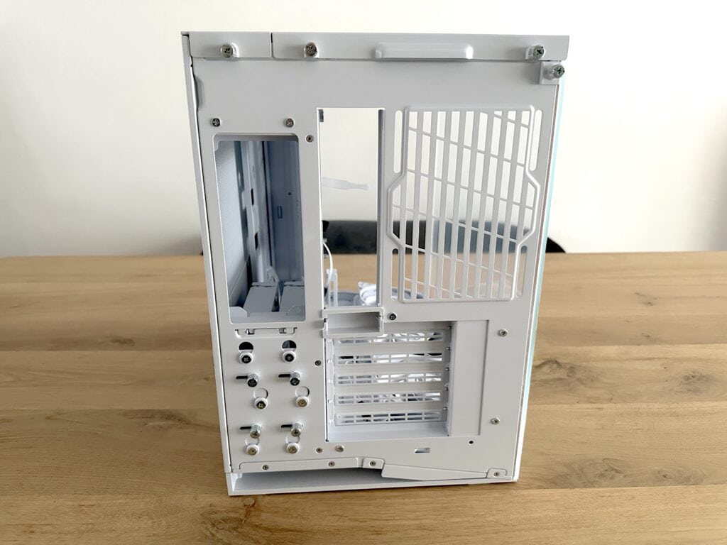 Wat echt fijn is, is dat deze cages helemaal uitneembaar zijn. Als je liever een strakkere binnenkant en beter kabelmanagement wilt, kun je ze eenvoudig verwijderen om zo extra ruimte te creëren achter het moederbordtray of voor een nettere afwerking. Dit laat goed zien dat Lian Li niet alleen oog heeft voor design en airflow, maar ook voor praktische flexibiliteit binnen de behuizing.
