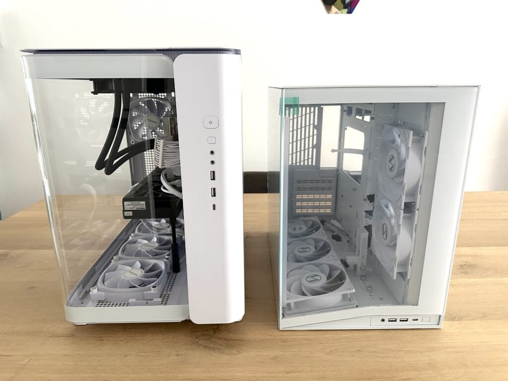 Hoe compact de O11D Mini V2 Flow echt is, zien we pas als we hem naast de eerder geteste Montech King 95 Pro zetten. In alle richtingen (lengte, breedte en hoogte) is de Mini V2 Flow echt een stuk kleiner, terwijl er wel ruimte moet zijn voor een volledige ATX-build. Dat is zonder meer knap te noemen!