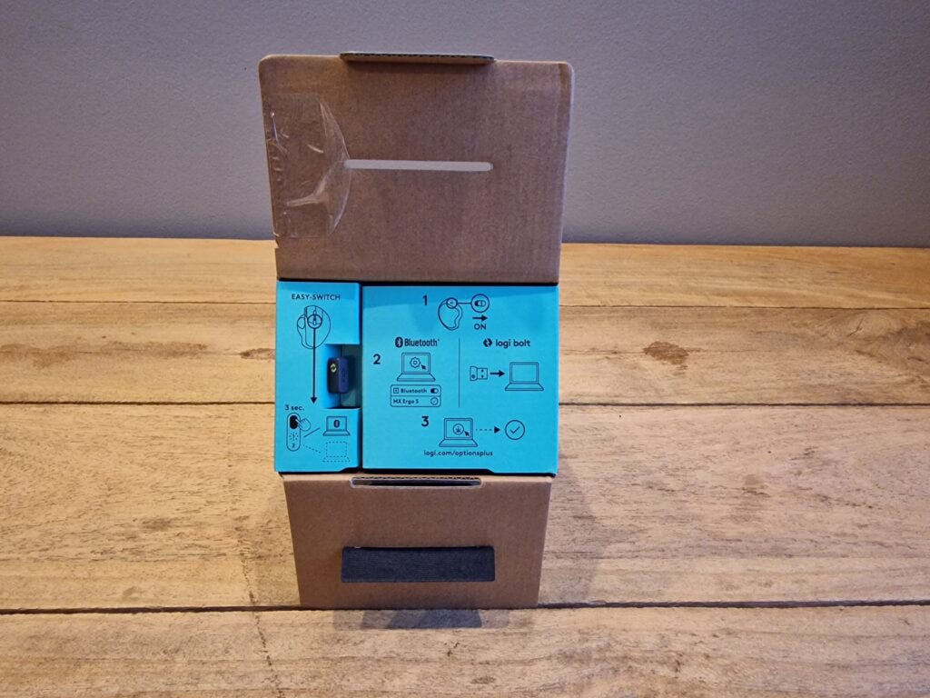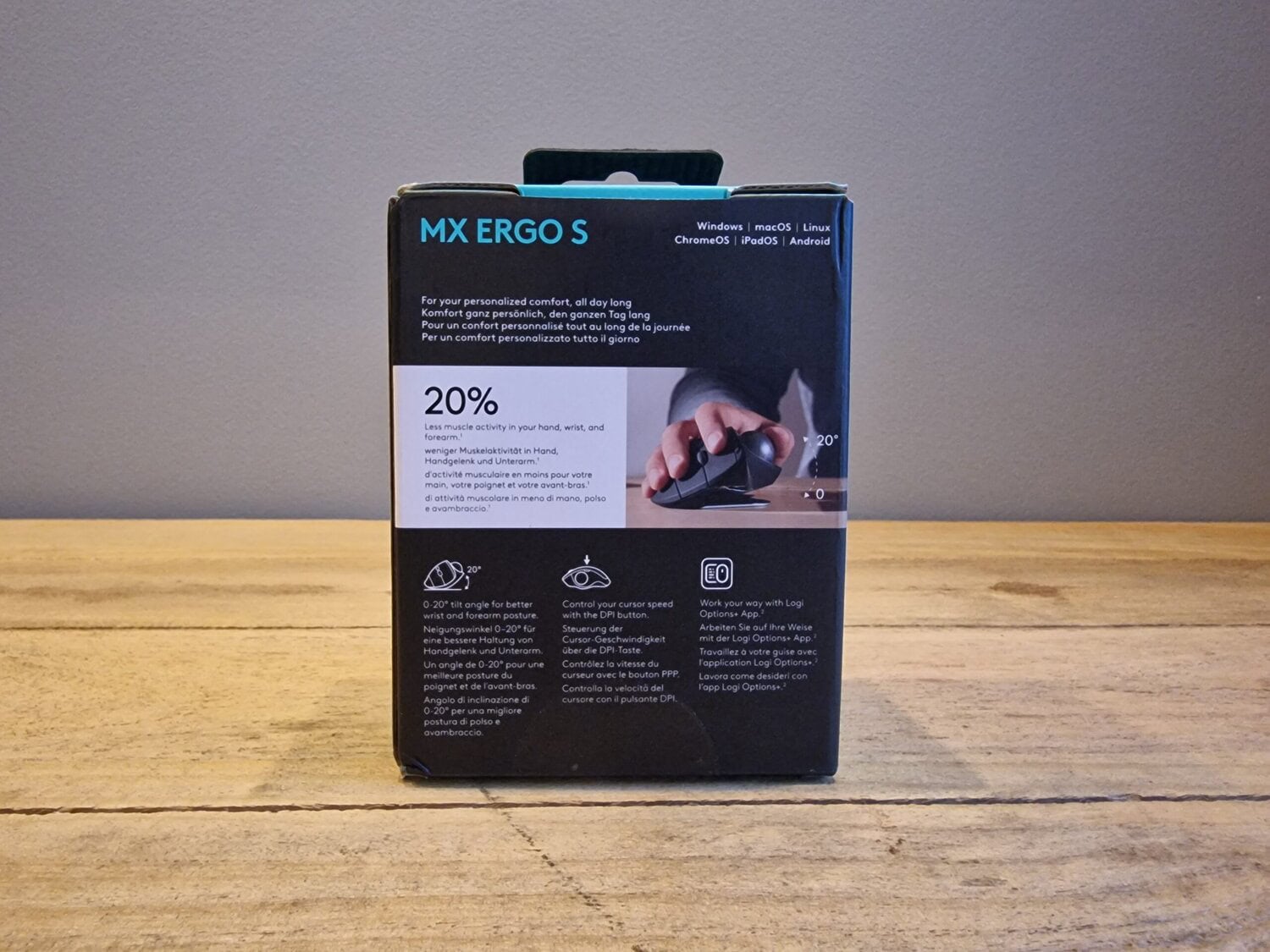 De MX Ergo S zit in een zwarte verpakking met een duidelijke foto van de muis zelf die pronkt op de voorkant van de doos. Op de achterkant van de verpakking zijn diverse specificaties en features af te lezen. Als je de doos openmaakt, kijk je als eerste tegen de instructies aan voor het verbinden van de muis met je computer/laptop. Ook zie je dan direct de Logi Bolt USB-ontvanger. In de doos zitten, behalve de MX Ergo S en de Logi Bolt USB-ontvanger, nog een aantal boekjes.