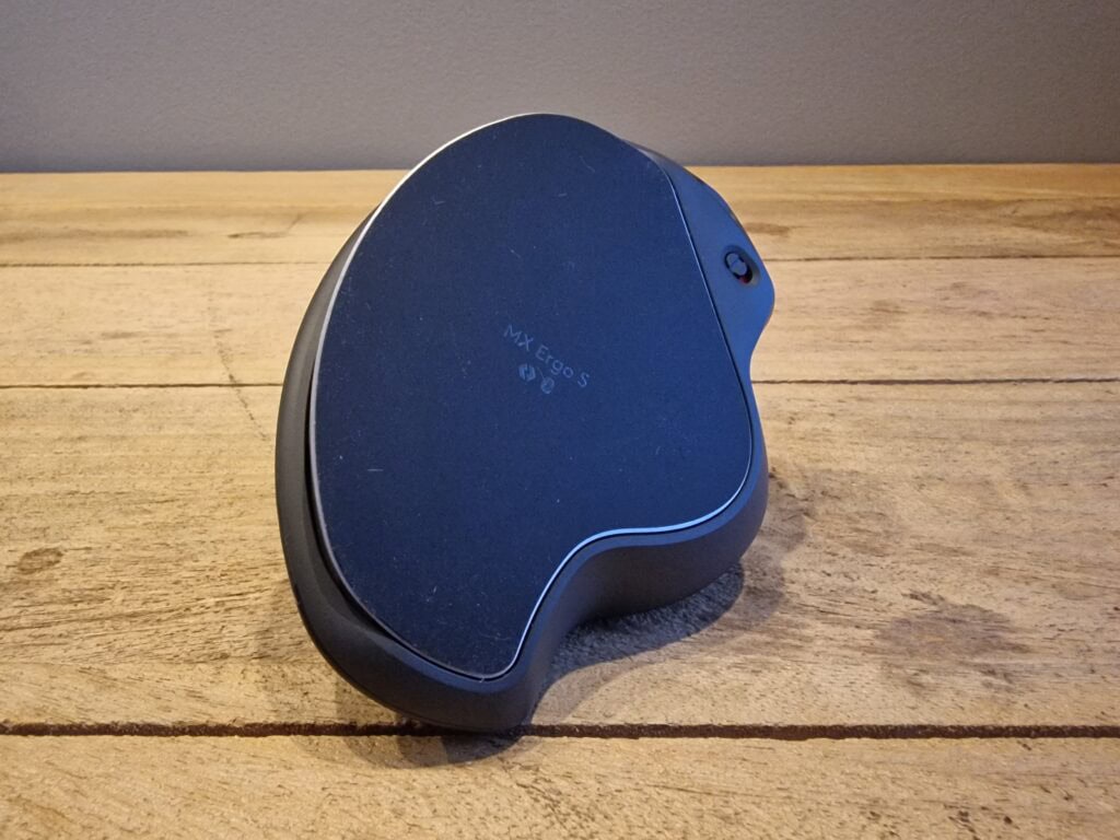 De MX Ergo S is kantelbaar, dat wil zeggen dat je de muis plat kan gebruiken of kan kantelen in een hoek van 20 graden. Dit doe je door wat druk te zetten op de linker- of rechterkant van de muis, waardoor de stand verspringt. Ik heb dit op onderstaande foto’s trachten in beeld te brengen. De onderkant van de muis is volledig van rubber/siliconenachtig materiaal, met daarin de naam van de muis verwerkt.