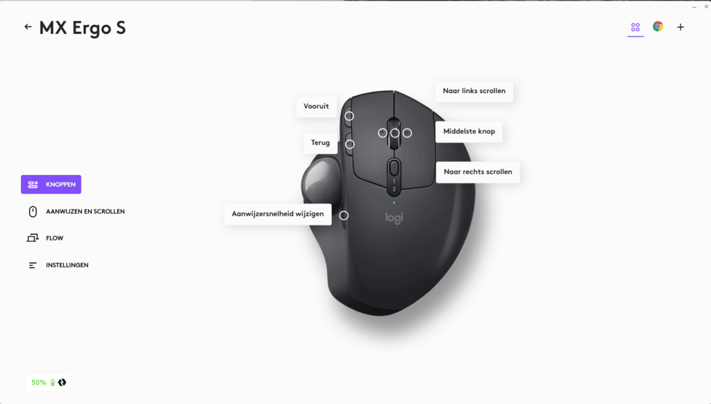 In de onderstaande galerij kan je alle details van de MX Ergo S goed bekijken. Aan de linkerkant van de muis hebben we de trackball en een knop waarmee je de aanwijzersnelheid kan wijzigen. De rug van de muis is voorzien van een “Logi"-logo. Verder hebben we op de bovenzijde van de muis een knop zitten met daaronder het cijfer 1 en 2. Hiermee kan je wisselen tussen twee verbonden apparaten. Uiteraard hebben we dan nog een linker- en rechtermuisknop en een scrollwiel. Normaliter heb je aan de zijkant van de muis nog een tweetal knoppen zitten. Die zitten bij de MX Ergo S echter bovenop de muis, naast de linkermuisknop.