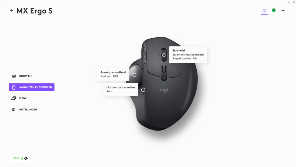 De batterijduur van de muis is wel aan te prijzen voor mij. Logitech zegt dat de muis met een volledige lading tot 120 dagen meegaat; de tijd om dat te testen heb ik niet. Echter, ik heb wel het idee dat dit kan kloppen. Toen ik de MX Ergo S voor het eerst aansloot op mijn computer, stond het percentage van de batterij op 50 procent. Nu, enkele weken later, geeft de batterij 45 procent aan. Het opladen van de muis gaat via USB-C. Helaas wordt er geen kabel meegeleverd, wat een bijzondere keuze is. Je kan de muis verbinden via de Logi Bolt-ontvanger die dan weer wel wordt meegeleverd of via Bluetooth Low Energy.