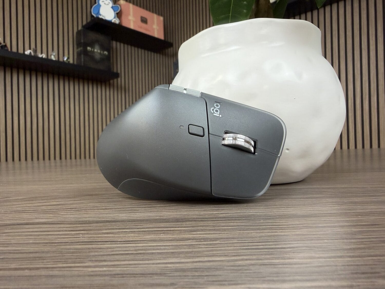 Laten we eerlijk zijn: de MX Master 4 is geen kleine jongen met zijn 150 gram. De muis ligt stevig in de hand, met die hoge bolling en brede duimsteun. Voor mensen met grote handen waarschijnlijk heerlijk — maar met mijn wat kleinere (vrouwen)handen voelt hij soms net wat log en onhandig. Ik red het prima voor dagelijks gebruik, maar echt ontspannen vasthouden? Dat is het voor mij helaas nét niet.