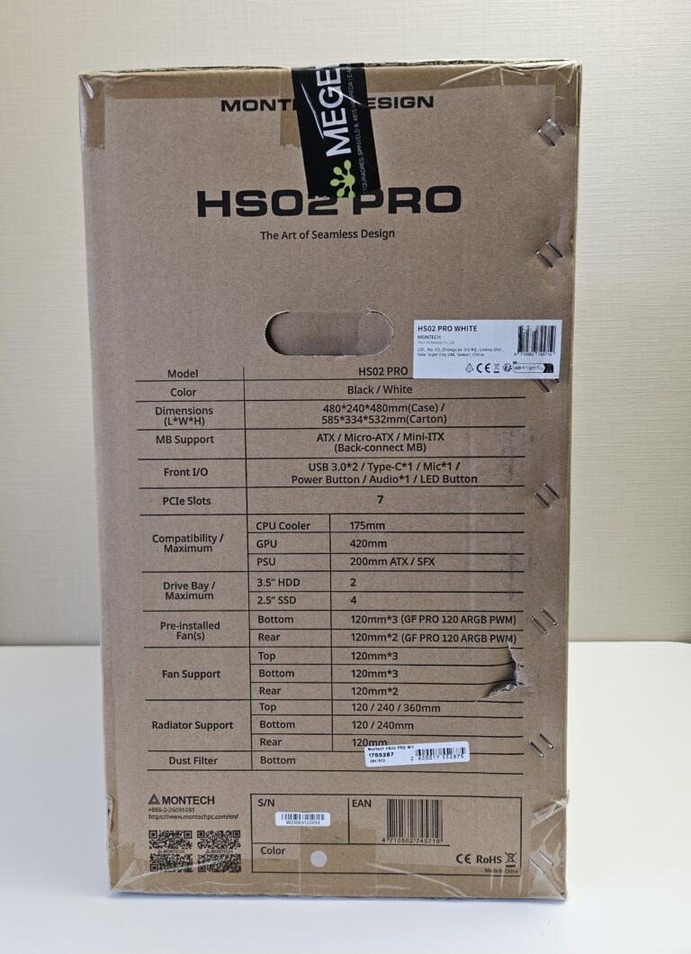 Op de voorzijde van de verpakking is een duidelijke technische illustratie van de Montech HS02 Pro te zien. Met deze tekening heb je al een duidelijk beeld van hoe de kast eruitziet. Aan de linkerzijde van de verpakking zijn de specificaties van de kast te lezen in een overzichtelijke tabel. Zo kan je hier zien wat de maximumhoogte van je CPU-koeler mag zijn of de lengte van de grafische kaart.