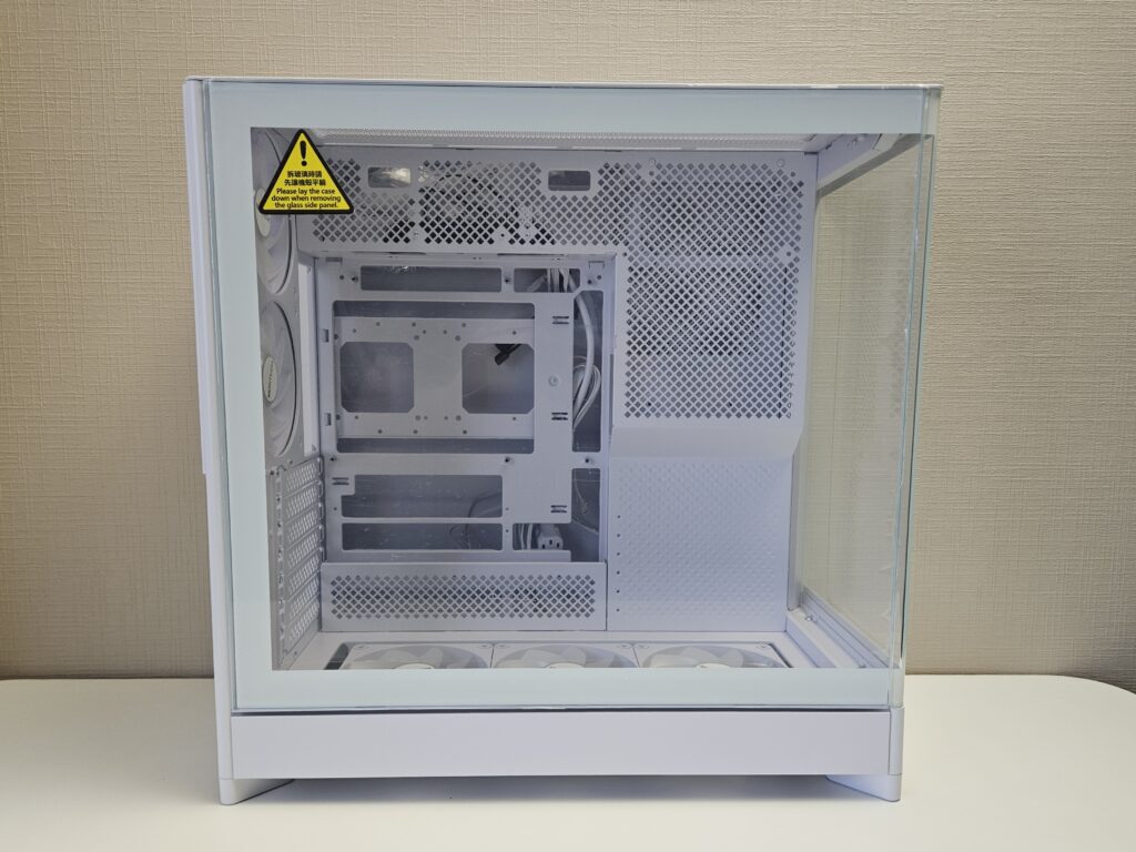 De Montech HS02 Pro heeft een unieke stijl. Laten we direct met de deur in huis vallen en beginnen over de glazen voorzijde van de Montech HS02 Pro. De glazen voorzijde is mooi afgewerkt aan de zijdes met een witte streep, wat zorgt voor een mooie overgang. De zijde aansluitend aan het glazen zijpaneel is gebogen op een hoek van 90 graden. Hiermee wil ik zeggen dat het gebogen glas maar een klein stuk is voor een visuele verstoring. Omdat dit maar over een kleine afstand gaat, heeft deze kast een echt panoramisch gevoel.