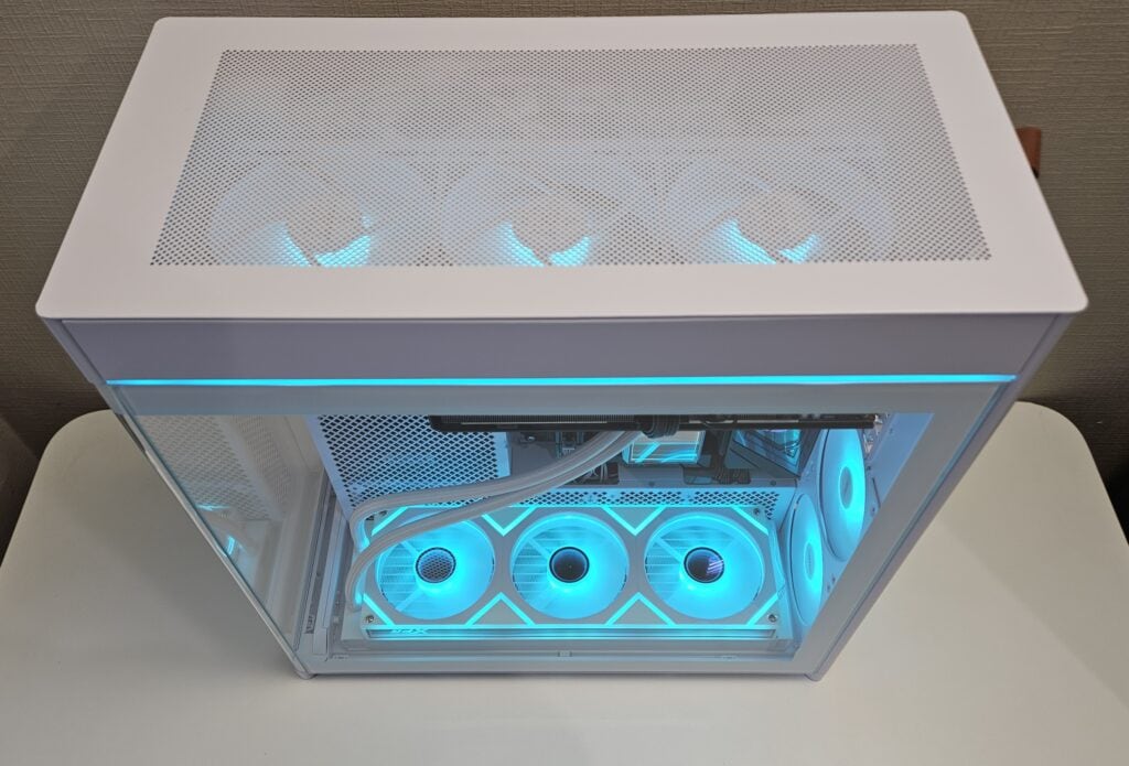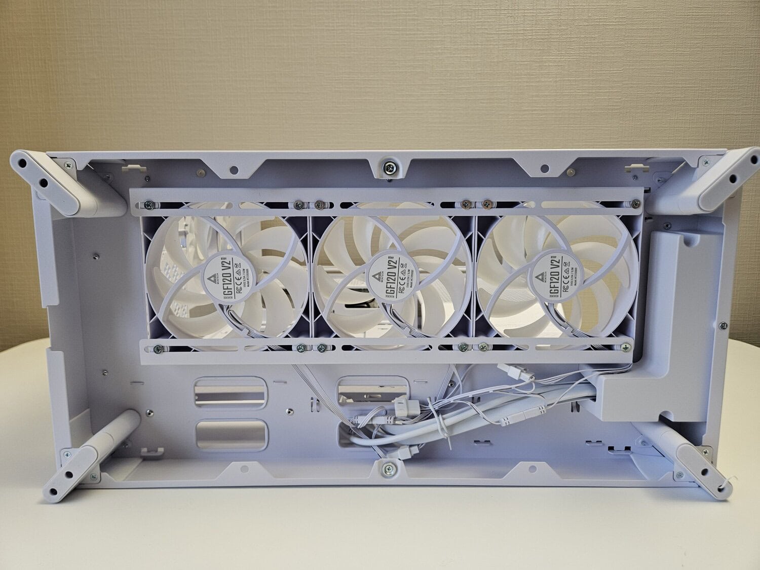 De ventilatoren die zijn meegeleverd met de PRO-versie zijn wel reverse blade-ventilatoren. Dit wil zeggen dat ze de luchtstroom in tegengestelde richting van standaard ventilatoren genereren, waardoor ze ondanks hun montagepositie toch frisse lucht kunnen aanzuigen en de esthetiek behouden doordat de mooie RGB-zijde zichtbaar blijft.