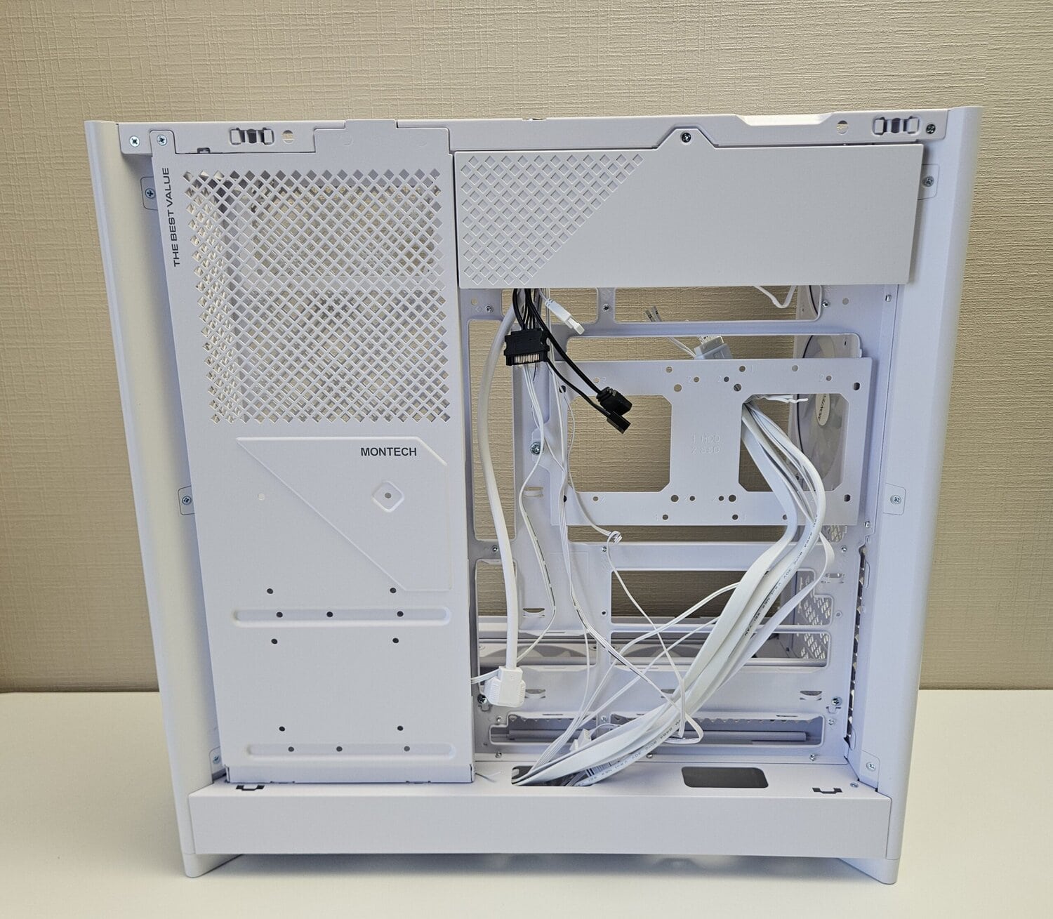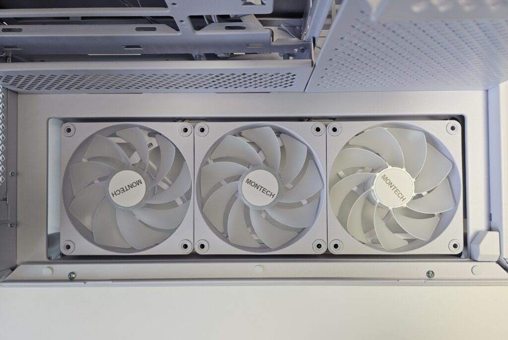 Wel blijft het altijd moeilijk om de voedingskabel van de grafische kaart mooi en op een esthetische manier weg te krijgen. Maar het feit dat Montech reeds alle fans geïnstalleerd had met het nodige kabelmanagement heeft ook zeker bijgedragen aan het bouwplezier.