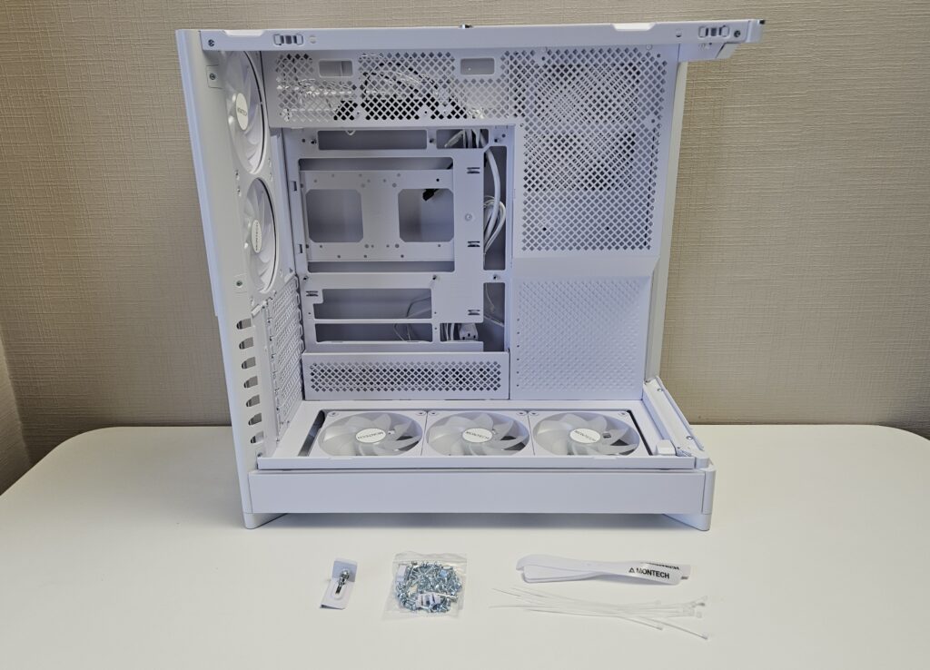In de doos bevindt zich de Montech HS02 Pro in het wit. In de doos bevindt zich ook de handleiding voor deze kast. In deze handleiding staan alle stappen goed uitgelegd met mooie en duidelijke afbeeldingen. Deze kast heeft ook enkele speciale features die ook allemaal uitgelegd staan in de handleiding, dus hiervoor zeker een plus. Verder zijn er in de kast ook nog enkele accessoires voorzien. Deze accessoires zijn te vinden bij de fan hub van deze behuizing. Deze fan hub zit aan de bovenzijde van de kast.