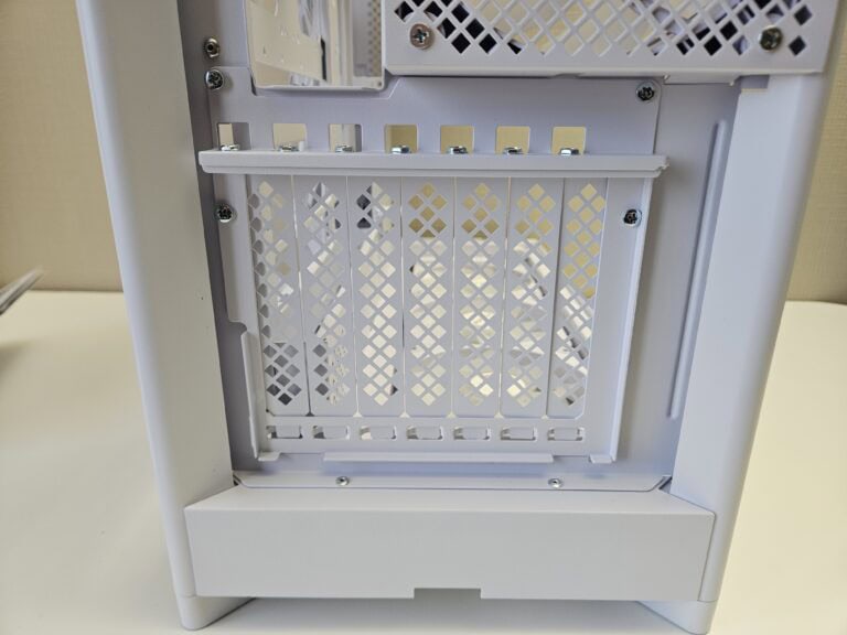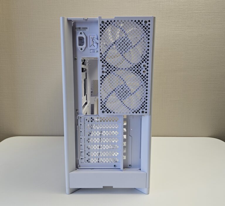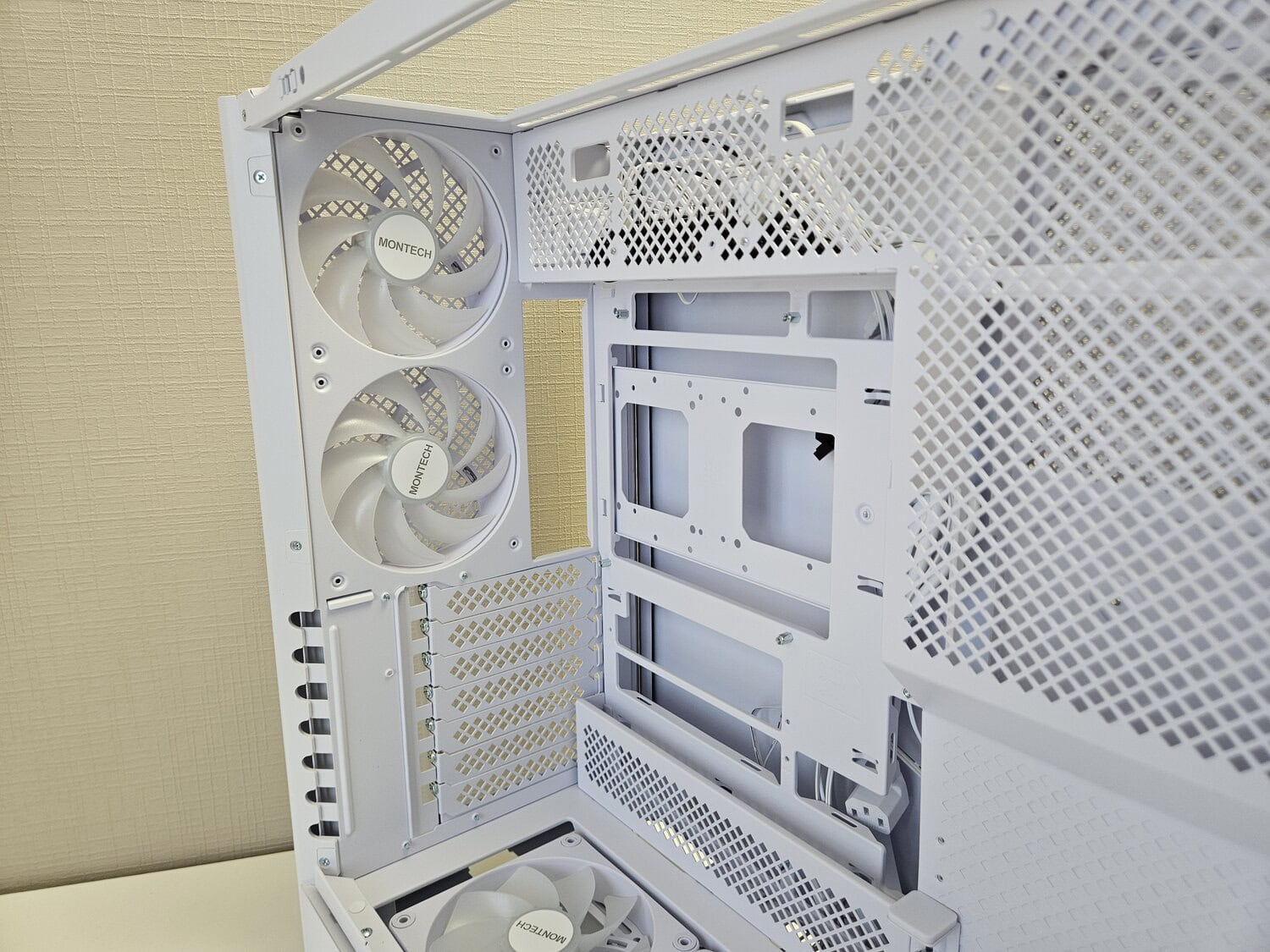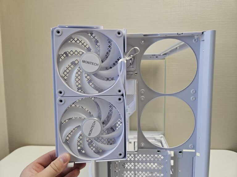 Ook heeft Montech ervoor gekozen om bij de HS02 Pro twee ventilatoren te voorzien aan de achterzijde. Dit is een feature die ik nog niet vaak gezien heb, maar die zeker een leuke feature is. Op de achterzijde van de kast bevinden zich ook de slotcovers voor de grafische kaart. Montech heeft ook de kast zo ontwikkeld dat deze slot covers verticaal geplaatst kunnen worden, zodat je ook je grafische kaart verticaal kan monteren. Als laatste is er een opening voorzien met een rubber stukje, zodat los van de ventilatoren aan de achterzijde gemakkelijk kunnen worden aangesloten.