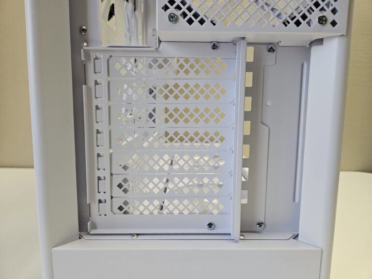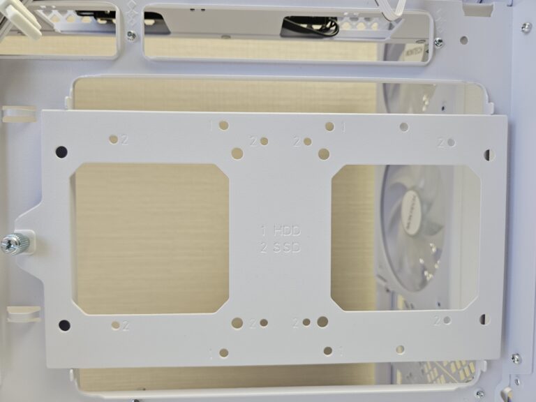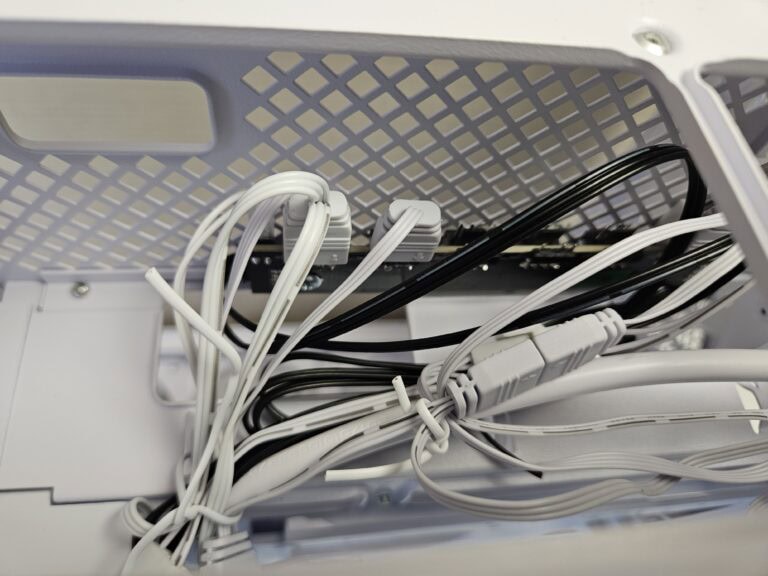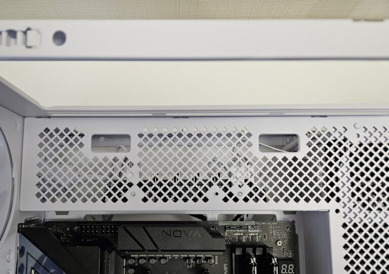 Net boven het moederbord is er een kleine ruimte voorzien waar de fan van deze kast zich bevindt. Dit is zeer goed gevonden, aangezien je vaak met alle fans- en RGB-kabels naar de achterzijde van de kast moet gaan, wat resulteert in een spinnenweb van kabels. Deze ruimte is ook niet meer zichtbaar als je gebruikmaakt van een AIO-koeler. Aangezien de combinatie van radiator en ventilatoren net hoog genoeg is om dit compartiment af te dekken. Als je gebruikmaakt van een luchtkoeler, zal de fan hub wel zichtbaar zijn door de mesh van de kast. Deze mesh is ook zichtbaar op andere plaatsen van de kast.