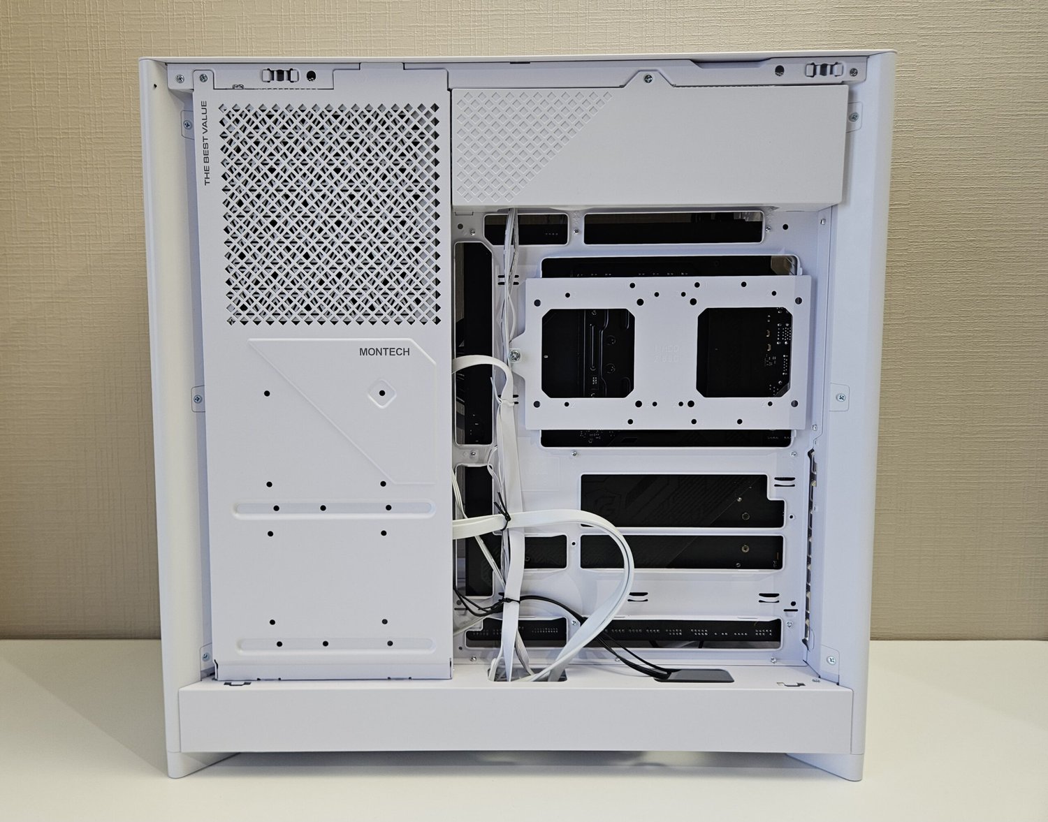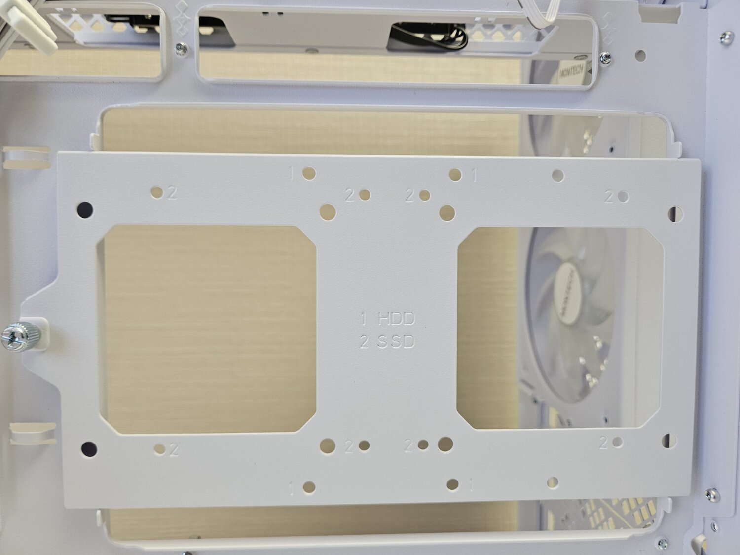 De binnenkant van de Montech HS02 Pro is ook voorzien van heel veel coole features. De kast komt standaard met een shroud geïnstalleerd die voorzien is voor mATX-moederborden. Deze shroud moet verwijderd worden voor het installeren van een ATX-moederbord. Deze shroud kan wel zeer handig zijn voor het verbergen van kabels in de kast. Dit in combinatie met het moederbord dat wat dieper in de kast gelegen is, zorgt ervoor dat de kabels zo weinig mogelijk opvallen. Dit zorgt voor een algemeen esthetisch mooier geheel. Ook zijn er op veel plaatsen uitsparingen voorzien om kabels door te laten passeren.