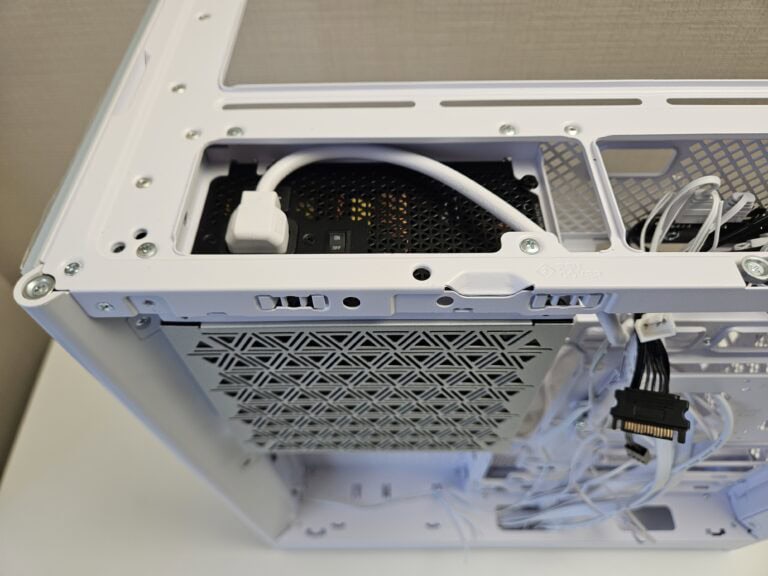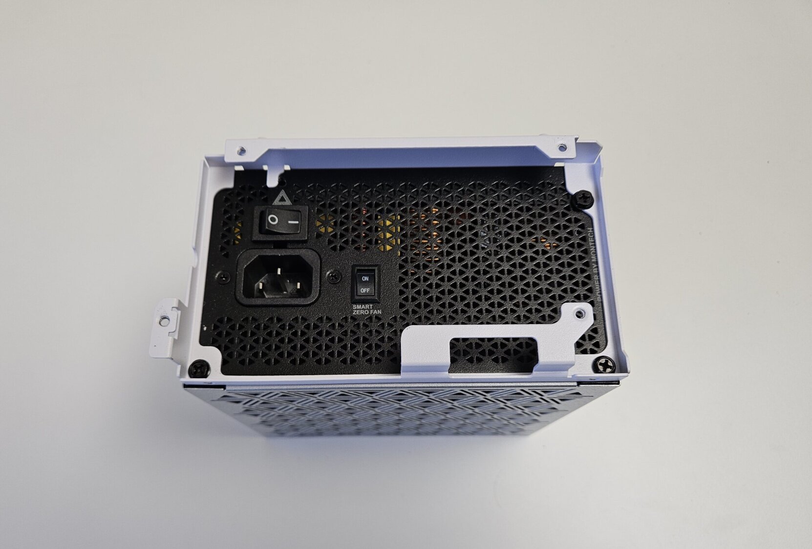 De voeding bevindt zich ook niet aan de achterzijde van de kast, maar aan de voorzijde van de kast. Dit is ongewoon, maar wel geen slechte locatie voor de voeding. De voeding kan worden vastgemaakt aan een voedingsbeugel die je vervolgens in de kast kan vastmaken. deze kast ondersteunt zowel ATX- als SFX-voedingen. Om spanning te voorzien aan de voeding is er een extender voorzien die je gemakkelijk in je voeding kan pluggen.