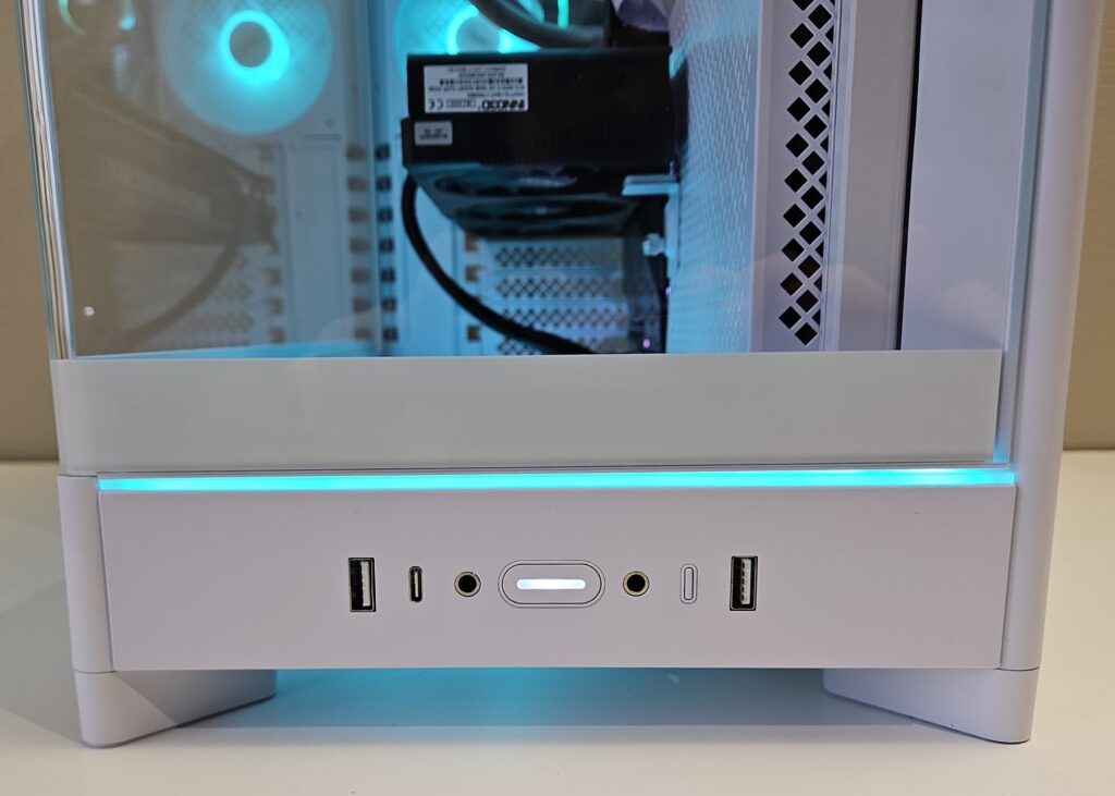 Onder het glazen gedeelte van de voorzijde bevindt zich de I/O van de Montech HS02 Pr. Dit bestaat uit twee USB 3.0-aansluitingen alsook een USB-C-aansluiting. Met nog elke microfoon als een audio-aansluiting. Al deze I/O is mooi symmetrisch opgesteld rond de aan/uitknop van de kast. Dit is zeer mooi gedaan; zelfs hebben ze de RGB-knop gemaakt in de vorm van een USB-C-aansluiting, zodanig dat dit zeer mooi oogt.