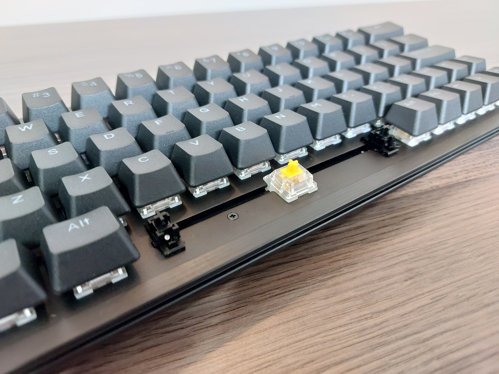 Het reviewmodel is uitgerust met Mountain lineair 45, waarvan het actuatiepunt op 2 mm ligt met een totale reisafstand (bottom-out) van 4 mm. De actuatiekracht ligt op 45 g. De Mountain 45 lineair speed pakken het sneller aan met een actuatiepunt van 1,1 mm en een totale reisafstand (bottom-out) van 3,4 mm. Ook deze Mountain-switch heeft een actuatiekracht van 45 g. De Mountain tactiel 55 pakt het anders aan, deze heeft een voelbaar punt van actuatie - in de vorm van een tactiele bump ter herkenning. Deze heeft net als de Mountain lineair 45 een actuatiepunt van 2 mm en een totale reisafstand (bottom-out) van 4 mm.