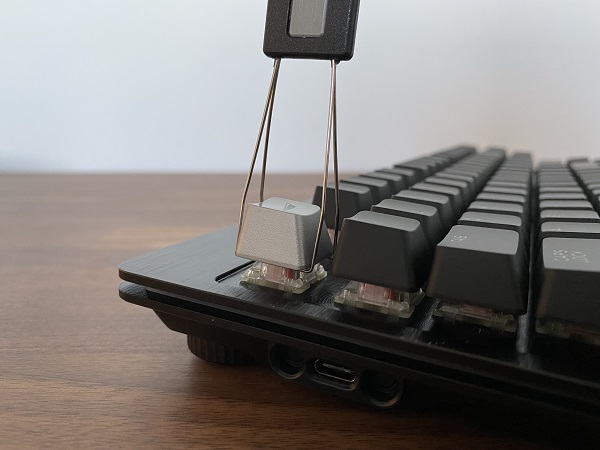 Terugkomend op hot-swappable, nu we de keycap-puller in actie zien. De handleiding omschrijft eenvoudig hoe je een Cherry MX switch demonteert. Hieronder laat ik het proces in een drietal foto’s zien; moeilijker is het niet.