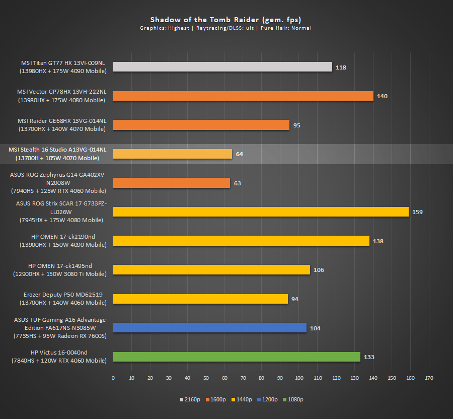 De Stealth 16 Studio laat een positieve indruk achter met wat duidelijke plus- en minpunten voor zijn vormfactor en slank ontwerp. Eerder in de review had ik het over onze guide aangaande de diverse vermogens van laptop-GPU’s. De MSI Stealth 16 Studio A13VG-014NL is uitgerust met een RTX 4070 Mobile met een TGP (Total Graphics Power) van 105 W. Dit is een aanzienlijk lager vermogen dan bijvoorbeeld de MSI Raider GE68HX 13VG-014NL met een RTX 4070 Mobile met een TGP van 140 W. Laten deze RTX 4070 Mobiles dan ook een verschil zien in prestaties op dezelfde resolutie? Jazeker!