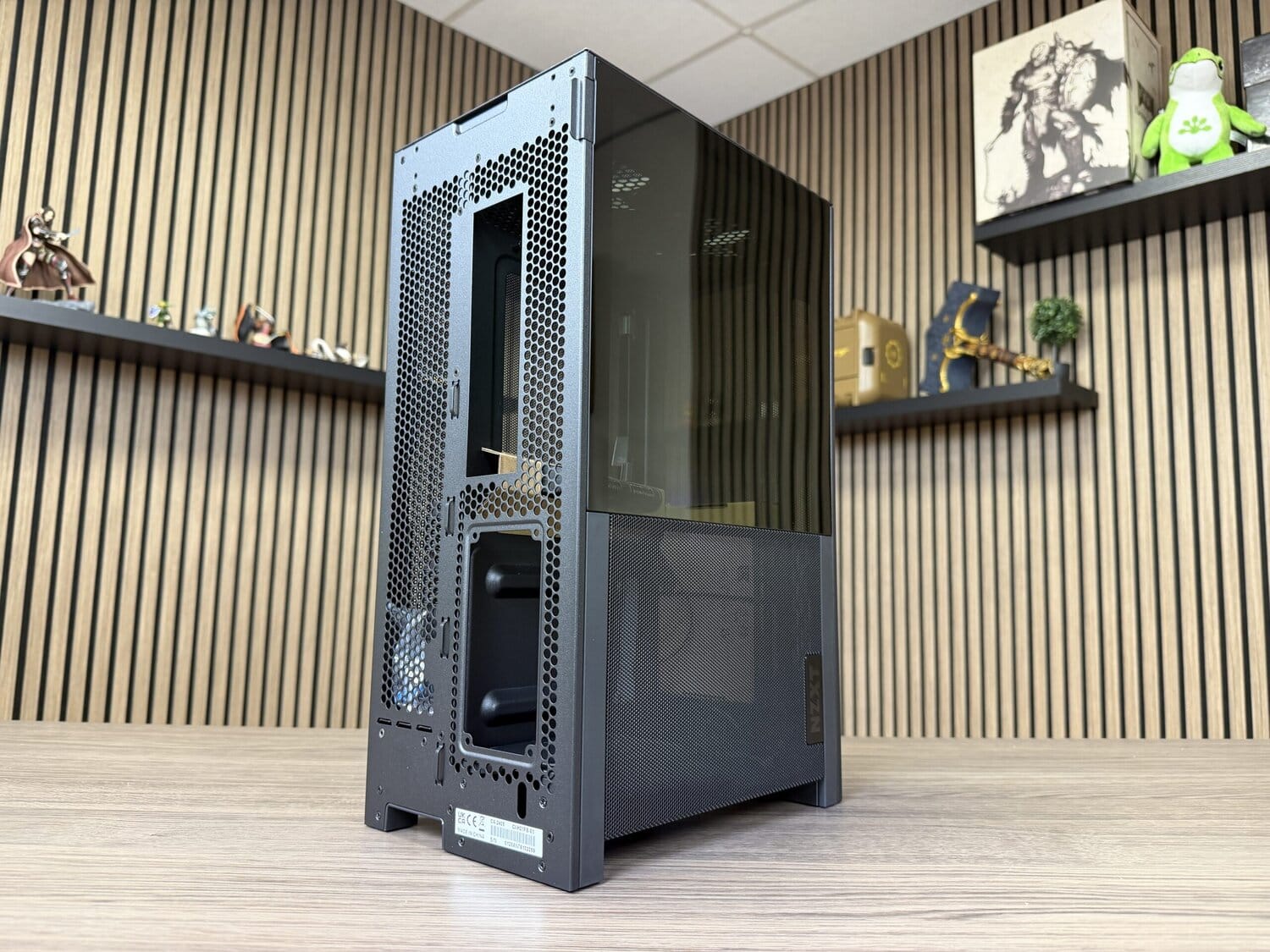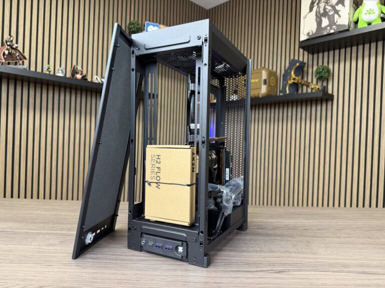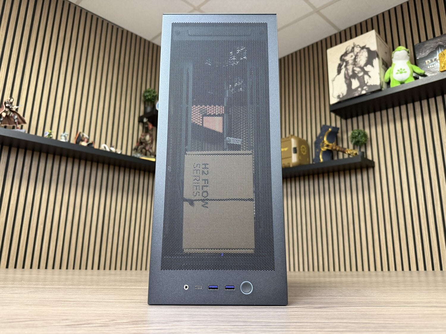 Wat wel grotendeels in stand blijft, is het ontwerp. Wederom is het een SFF-behuizing met een kleine voetprint die de hoogte in gaat. De H2 Flow is dan wel wat groter dan zijn voorgangers; in persoon merk je dit niet direct.