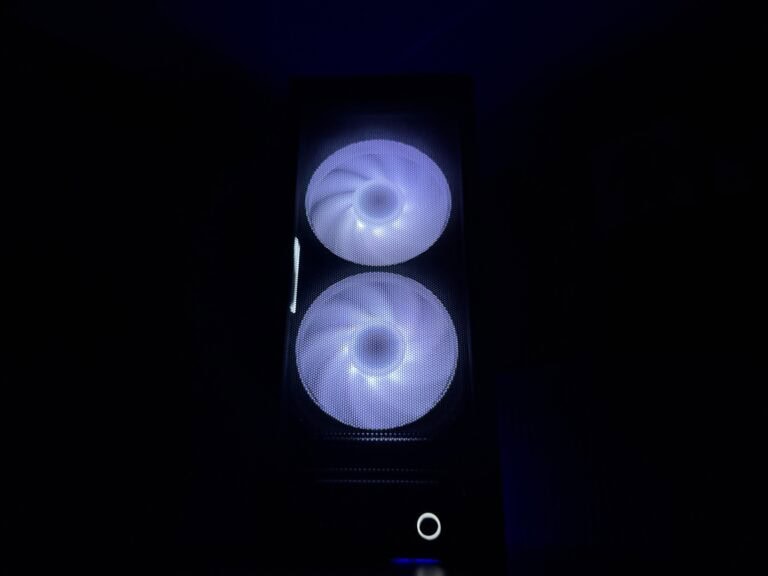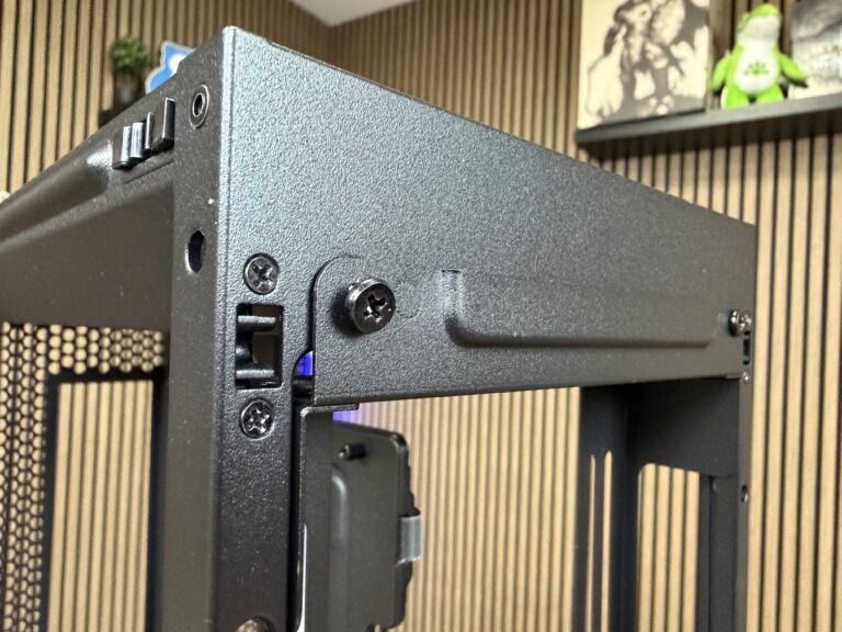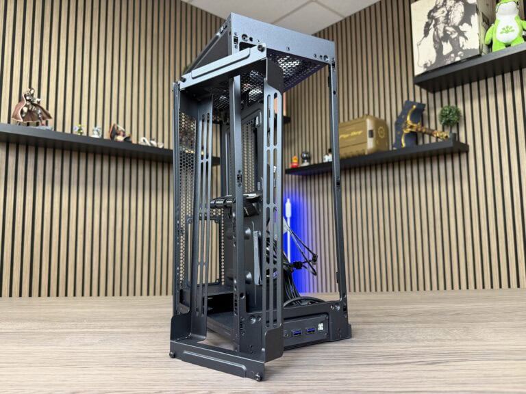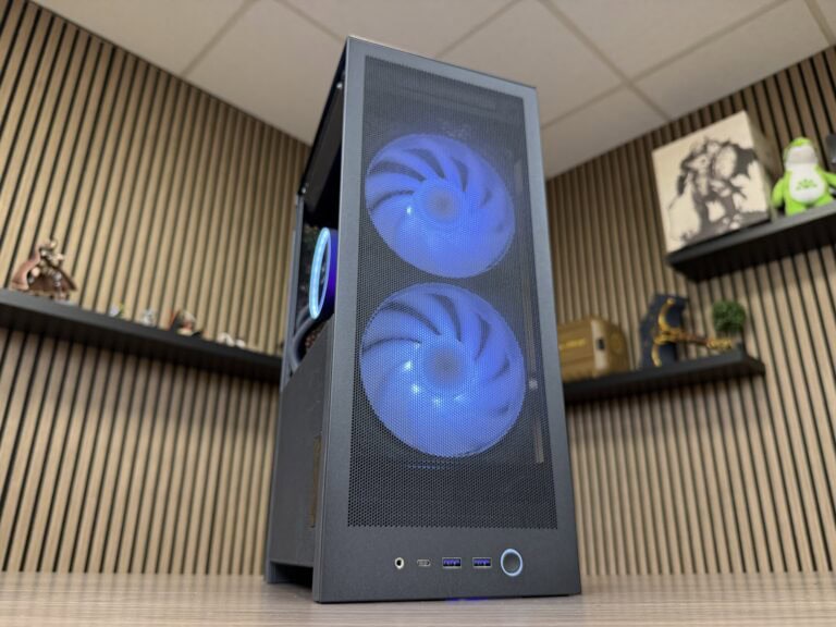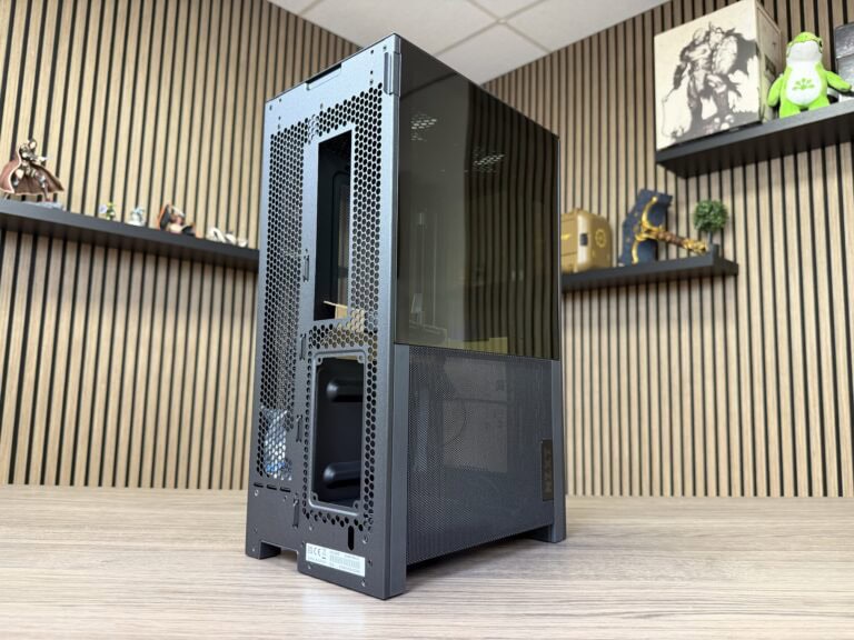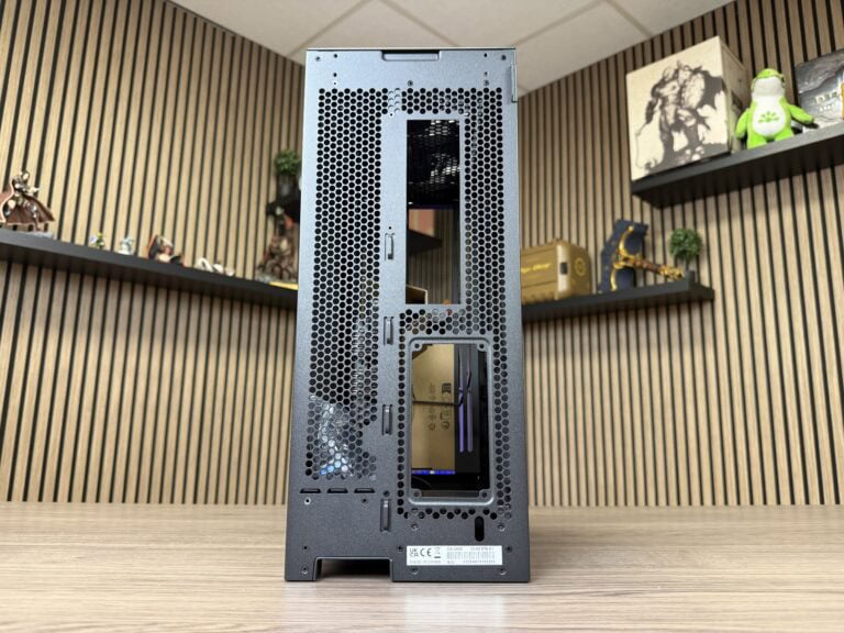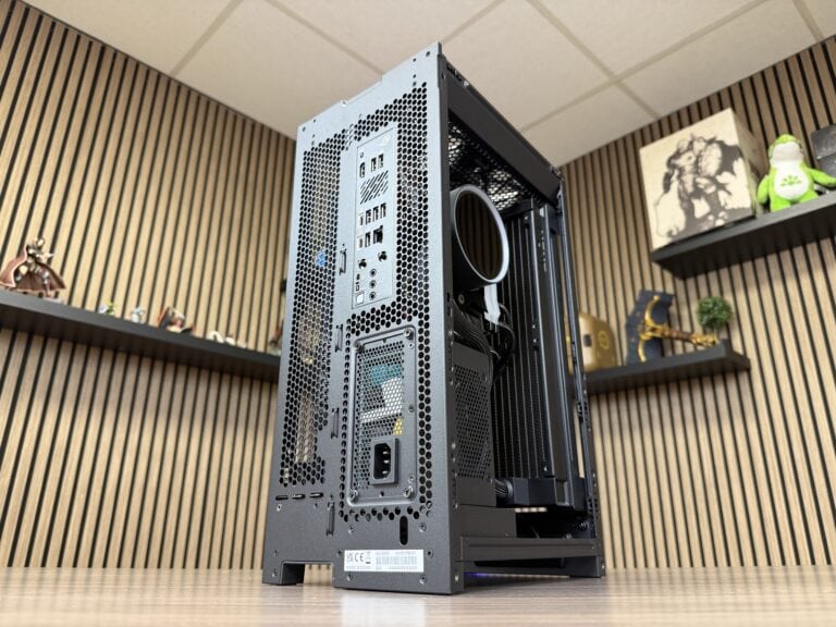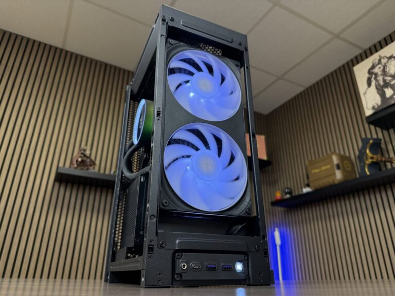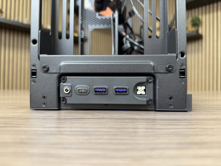 Het I/O vinden we niet bovenop de behuizing, maar dit keer vooraan de behuizing. Dit verbetert de toegankelijkheid op het bureau. Het I/O bestaat uit een powerknop, twee USB 3.2 Type-A-poorten, een USB 3.2 Gen 2×2 Type-C-poort en een headset Jack.