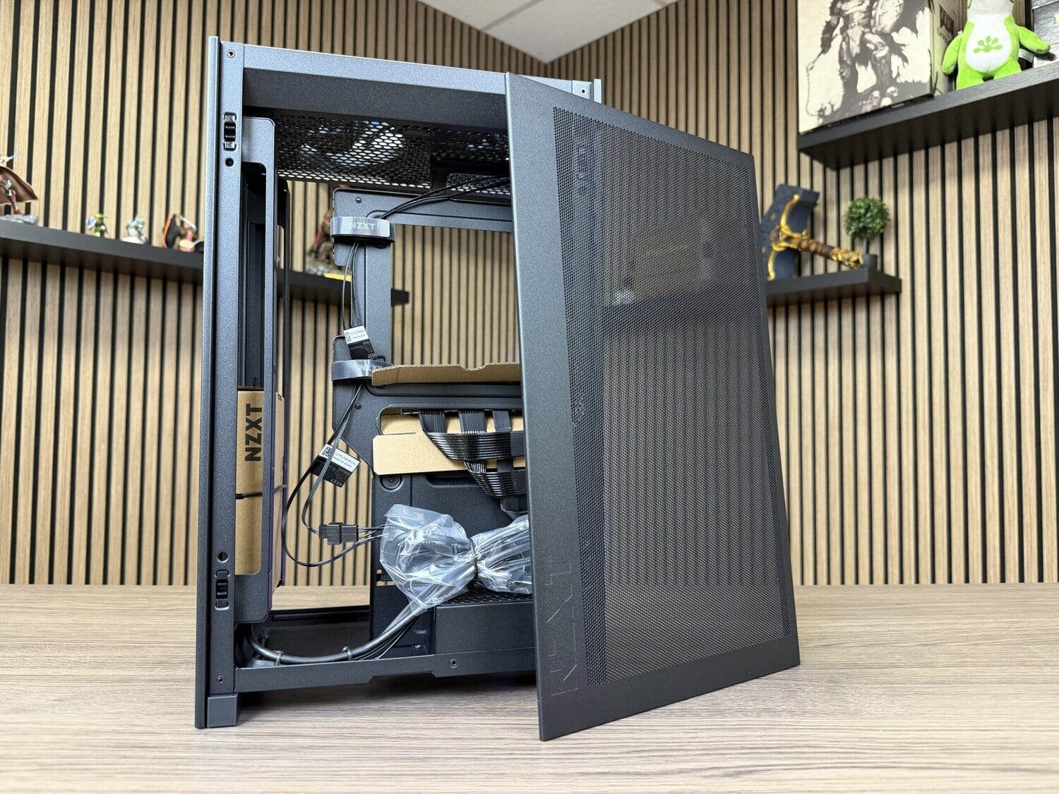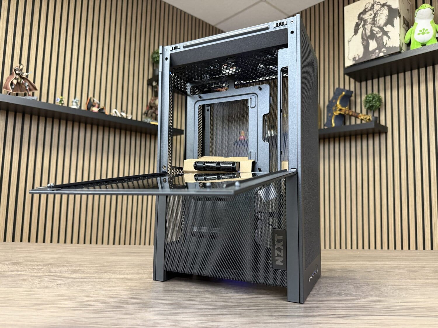 Toegang tot de binnenkant van de H2 Flow is volledig toolless; dit geldt overigens voor alle panelen op de behuizing. Het paneel van gehard glas blijft hangen in de behuizing; echter, je moet deze wel ondersteunen, anders klapt deze door. Op het mesh-gedeelte vinden we het woordmerk van NZXT terug.