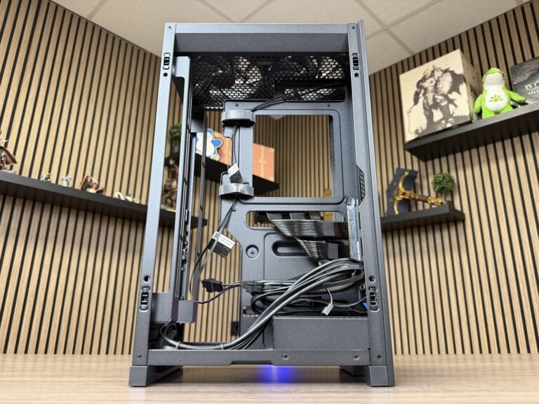 Het inbouwen van de behuizing gaat dankzij de verwijderbare panelen erg vriendelijk. Er zitten wat handigheidjes in als het om het alvast verbinden van kabels gaat op het moederbord, vooraf aan het plaatsen van de videokaart. Met de meegeleverde handleiding werkt dit overigens erg gemoedelijk.