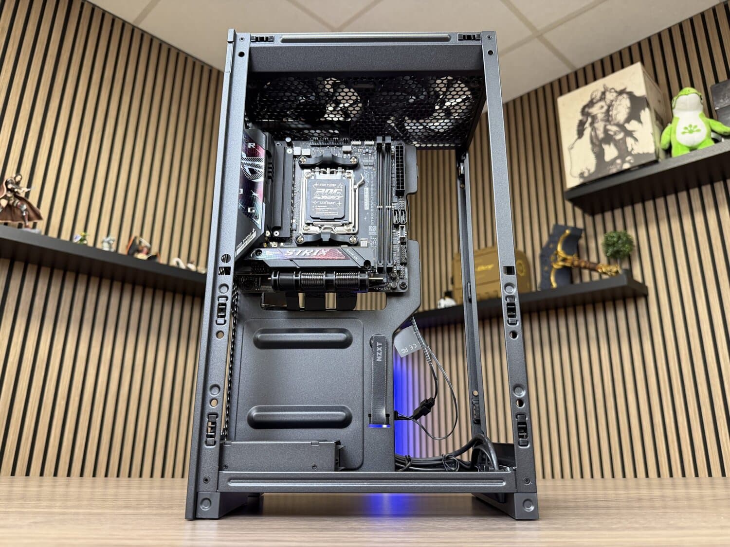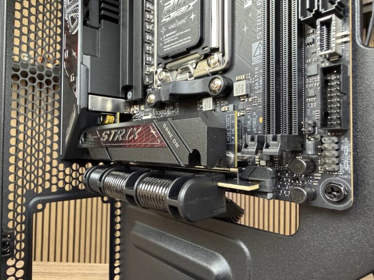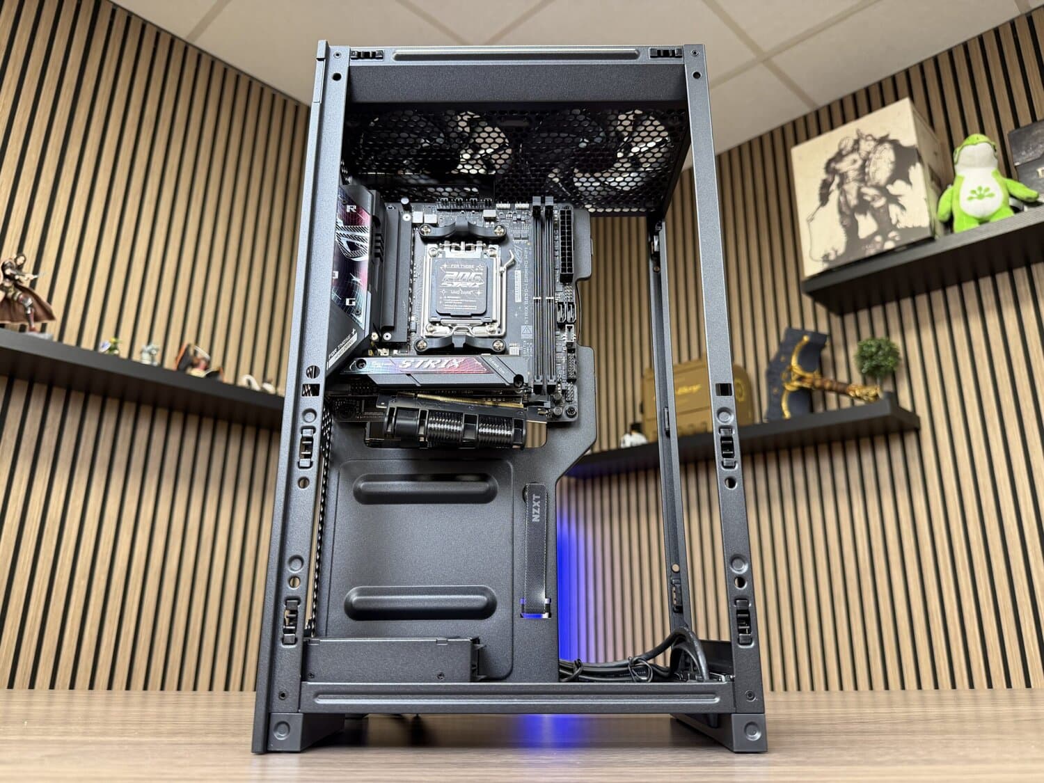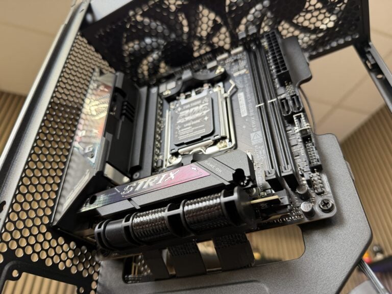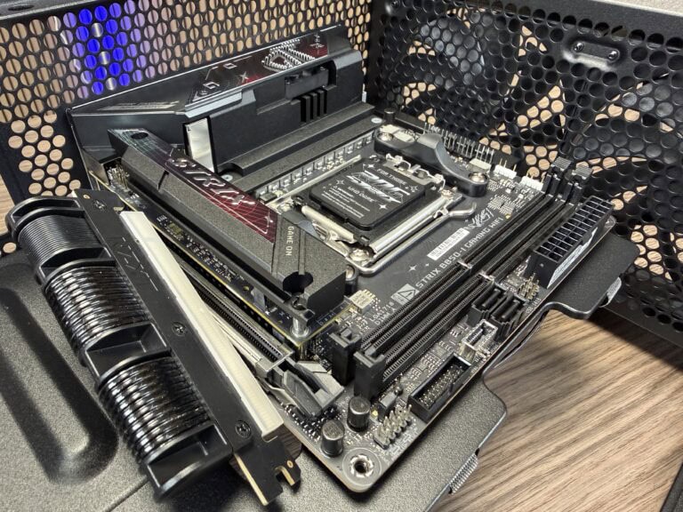 We gaan door met het leukste onderdeel van de review: het inbouwen. De H2 Flow biedt ondersteuning voor een Mini-ITX moederbord. In ons geval maken we gebruik van de ASUS ROG Strix B850-I Gaming WiFi. We hebben als eerste het moederbord op zijn plaats geschroefd, waarna we direct de PCIe 5.0-riserkabel hebben aangesloten op het PCIe 5.0 x16-slot. Je merkt écht dat de kabel vrij stug is, dus het kan even priegelen zijn.