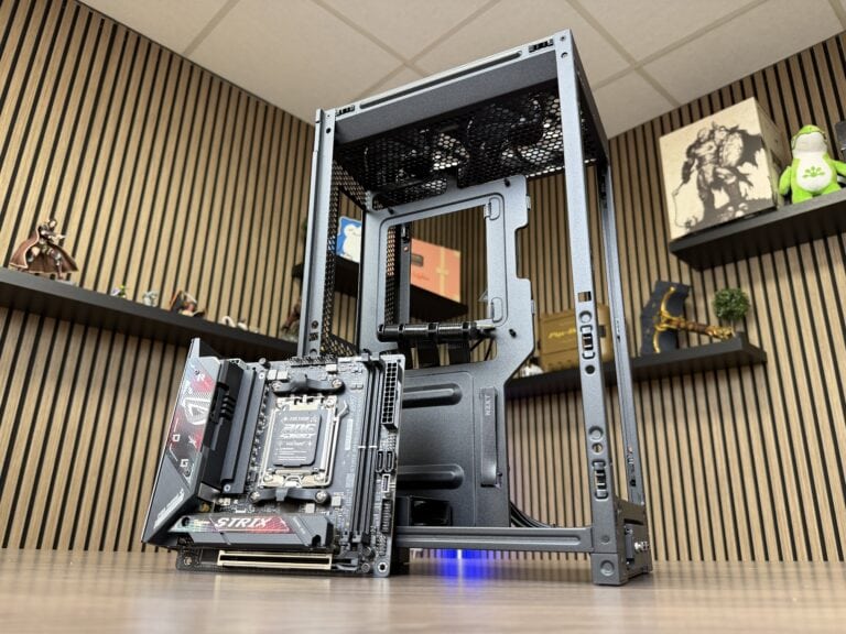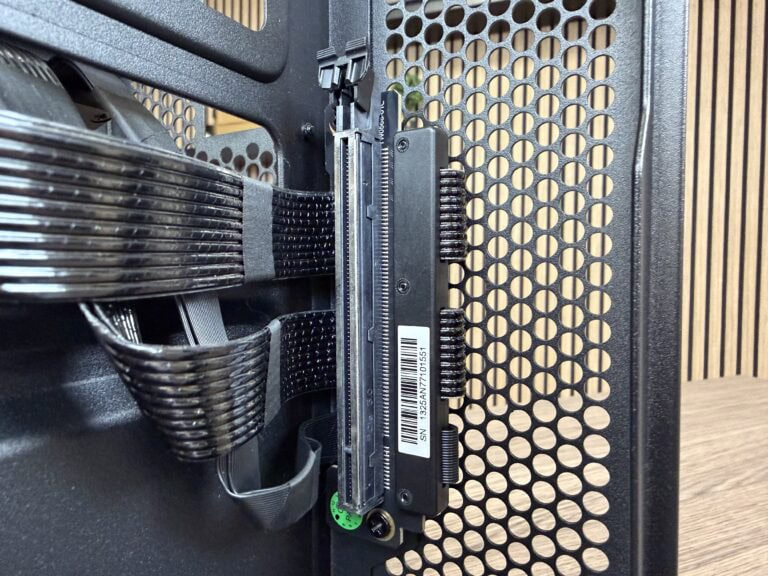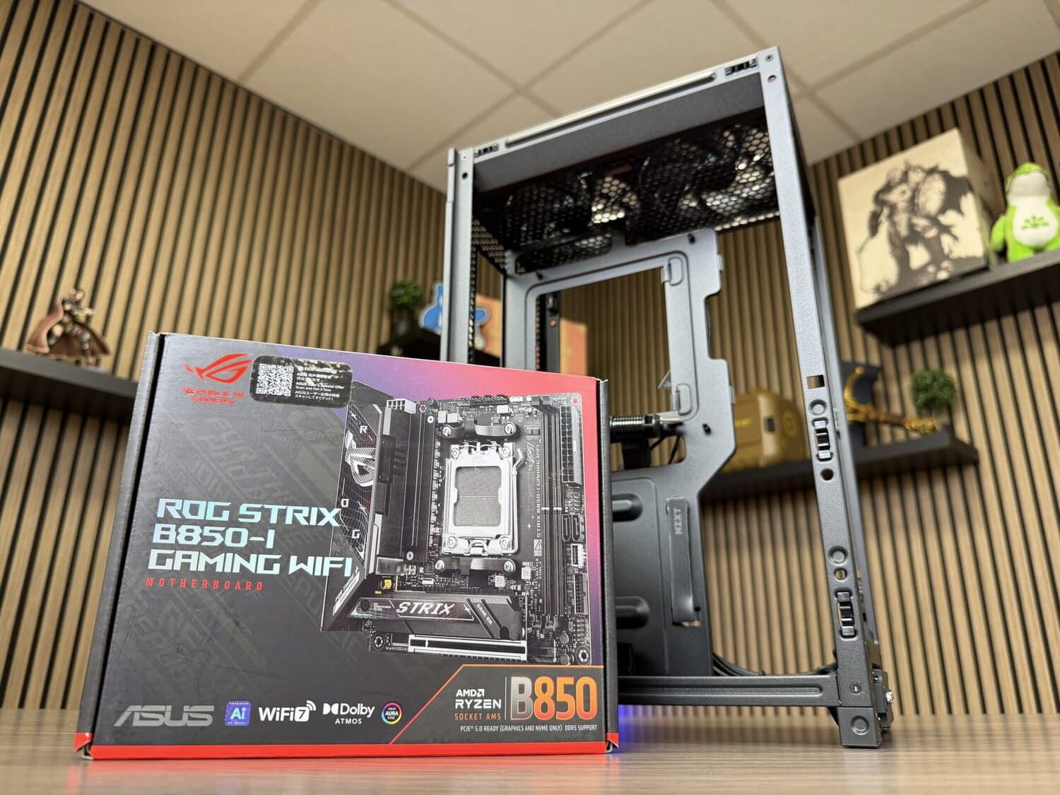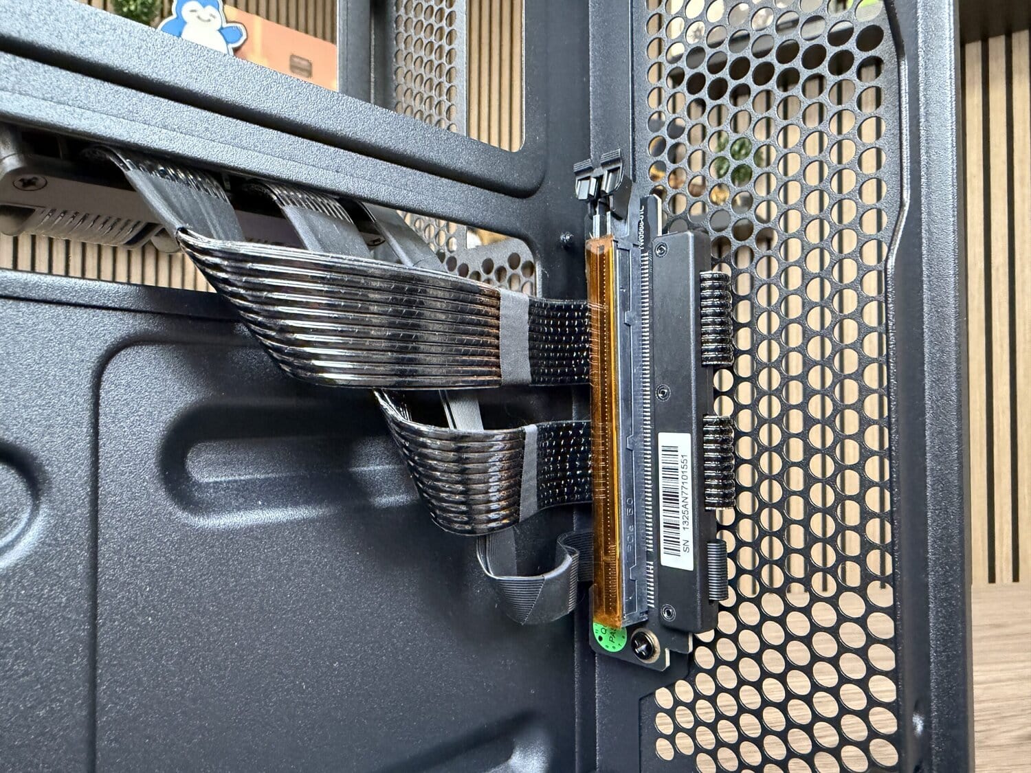 We gaan door met het leukste onderdeel van de review: het inbouwen. De H2 Flow biedt ondersteuning voor een Mini-ITX moederbord. In ons geval maken we gebruik van de ASUS ROG Strix B850-I Gaming WiFi. We hebben als eerste het moederbord op zijn plaats geschroefd, waarna we direct de PCIe 5.0-riserkabel hebben aangesloten op het PCIe 5.0 x16-slot. Je merkt écht dat de kabel vrij stug is, dus het kan even priegelen zijn.