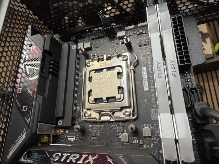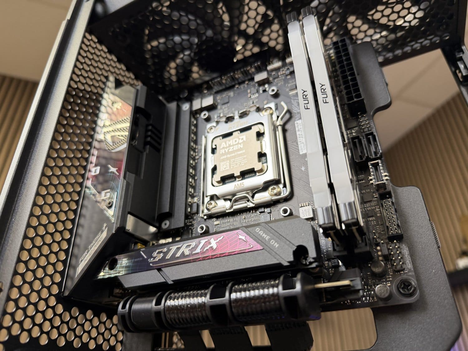We plaatsen stap voor stap de hardware, zodat je een goed beeld krijgt van de totale samenstelling en hoe dit vorm krijgt. De AMD Ryzen 5 9600X neemt vervolgens plaats in zijn socket-zetel, gevolgd door een Kingston Fury Renegade DDR5 RGB KF576C38RSAK2-32 geheugenkit. In de tussentijd hebben we de Kingston Fury Renegade G5 4TB ook nog op zijn plaats geprikt.