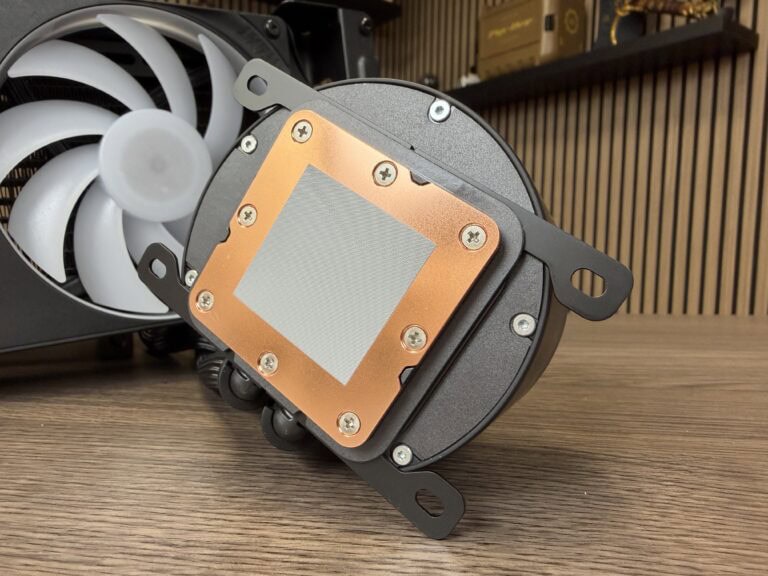 Het maximale formaat voor een all-in-one-waterkoeler betreft 280 mm. Complementair aan de build hebben we gekozen voor een NZXT Kraken Elite 280 RGB. Deze komt met een 280 mm-fan. Voor de plaatsing hebben we de standaard AM5-kunststof-brackets verwijderd en vervangen we deze door vier metalen afstandsbusjes.