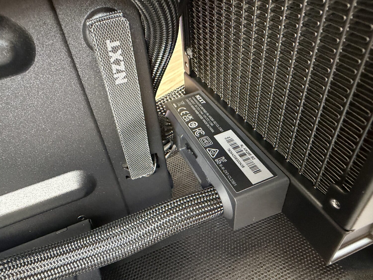 De Kraken Elite 280 RGB zit nu op zijn plaats. Wat is ons opgevallen? De Kraken Elite 280 RGB maakt gebruik van een prachtig systeem waar kabels op de radiator aangesloten worden. Deze biedt sturing voor de pomp, fans en RGB-verlichting. De controller met moederkabel op de radiator maakt de radiator dikker, wat een obstructie opleverde aan de bovenzijde tegen de moederbordtray. We hebben de bracket 180 graden gedraaid, waarna deze niet direct op zijn plaats kwam, maar met wat extra aandacht lukte dit uiteindelijk wel. Kortom: met de Elite-serie is er wat extra aandacht nodig.