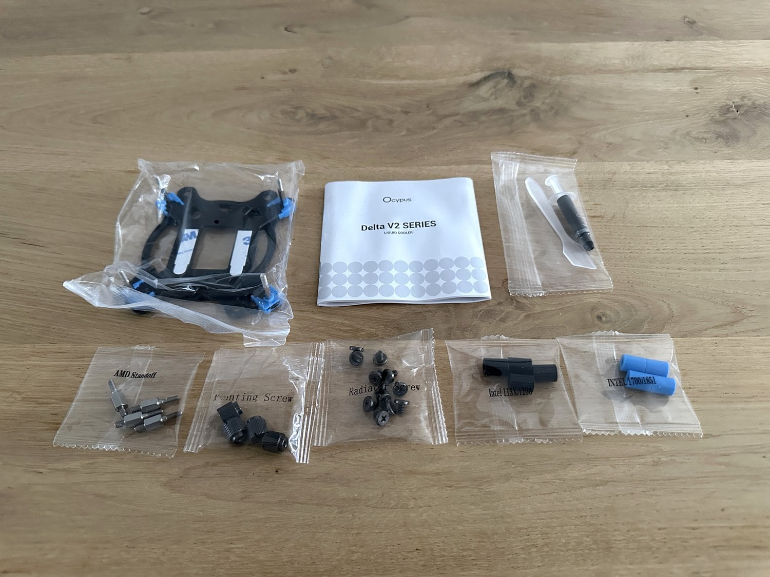 In de verpakking van de Ocypus Delta L36 V2 vind je alles wat je nodig hebt voor de installatie: een duidelijke handleiding, alle montagematerialen voor zowel AMD- als Intel-sockets, en de gebruikelijke accessoires.