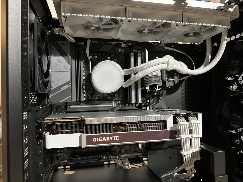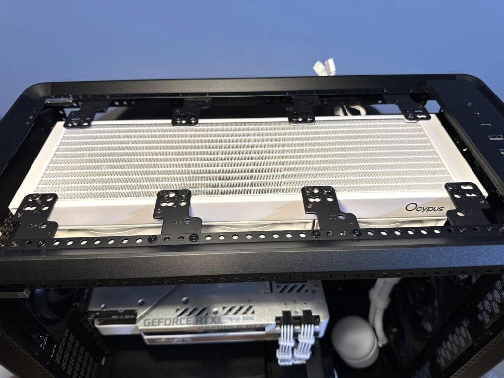 Omdat de ventilatoren van de Ocypus Delta L36 V2 al vooraf op de radiator zijn gemonteerd, verloopt de installatie bijzonder soepel. We hoeven de radiator enkel nog met de meegeleverde schroeven aan de bovenkant van de behuizing vast te zetten — en dat is zo gebeurd.