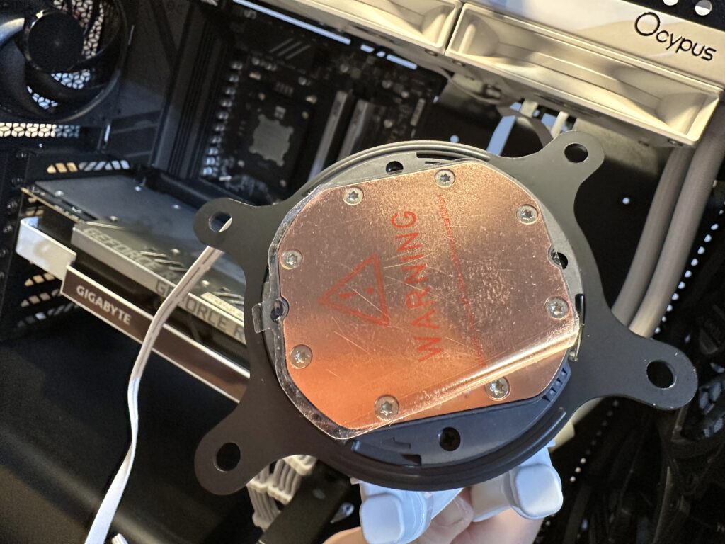 Nu alles op zijn plek zit, is het tijd voor de laatste stap in de installatie van de Ocypus Delta L36 V2. We beginnen met het verwijderen van de beschermfolie van het koperen koelblok - dit is een cruciale stap die je echt niet wilt overslaan. Daarna kunnen we de meegeleverde koelpasta op de CPU aanbrengen, zodat de warmteoverdracht optimaal is zodra de pomp wordt geplaatst.